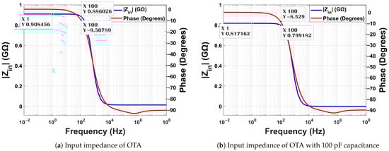 Figure 10a,b present the input impedance of the OTA. Within 1–100 Hz frequency, the impedance varied in the viccinity of 908 to 886 M. A small drop to 817–799 M is observed when 100 pF as the input pad capacitance is considered. A 10-channel NA is realizable with this input impedance.