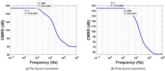 Achieving a high for the multi-channel NA requires a high , which is achieved by the designed OTA shown in Figure 11. Figure 9d illustrates the common-mode gain. The design achieves a value of 144.9 dB in post-layout simulation.
