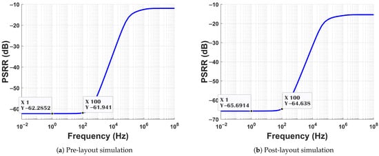 The simulation achieves a high value of 64.6 dB at 100 Hz in the post-layout simulation illustrated in Figure 12b, which is 3 dB more than the pre-layout simulation shown in Figure 12a. Given the nature of power supply noise being small, 64.6 dB is sufficient for rejection.
