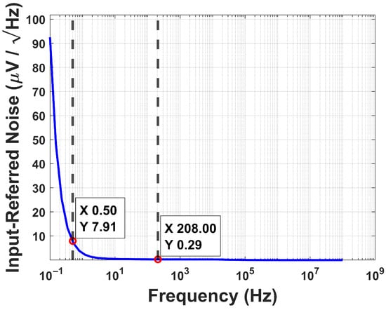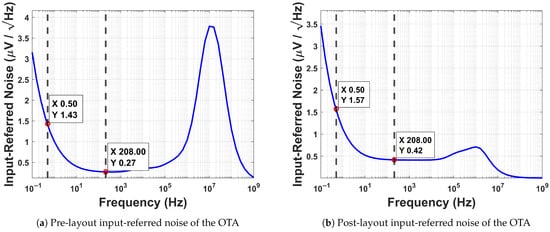 Figure 13 demonstrates the noise analysis of the OTA. The integrated input-referred noise from 0.5 to 208 Hz is 4.51 , and from 0.5 to 1 kHz, it is 8.82 . Such a low IRN is attributed to the selection of wider cascoded input pairs and current mirrors, which are designed using pMOS transistors.