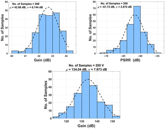Figure 14 reveals the Monte Carlo simulations for 200 samples for gain, and . A standard deviation of < 3 dB can be considered insignificant, which is obeserved for the gain and plots. The lowest value (120 dB) from the Monte Carlo simulation nevertheless yields a respectable of 65.66 dB for N = 10 channels.