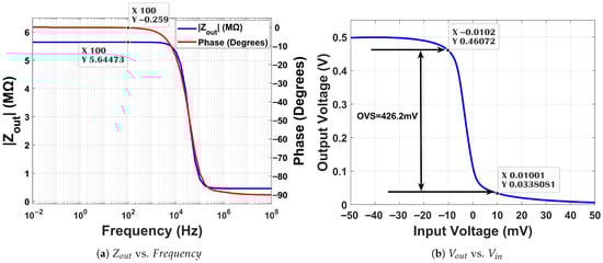 Figure 16a reveals an output impedance of 5.18 M. The composite transistor paired with the subthreshold operation of devices ensured a high output swing of 426.2 mV, which is presented in Figure 16b. The fully differential output is also responsible for this high swing. High output swings are a desirable trait in extracting signals.
