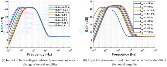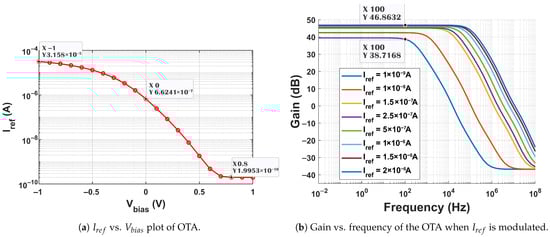 Figure 17 shows the effect of modulating the of the OTA, which results in modulation. When the is varied from −1 to 1 V, the reference current is modulated from 31.5 A to 0.2 nA. The reference current () modulation (1 nA–2 A) changes the gain of the amplifier from 46.86 to 38.71 dB. This modulating feature is particularly desirable for post-fabrication tuning. Simulations reveal further that when the reference current is varied from 1 nA to 1 A, the GBW is varied from 15.51 kHz to 6.25 MHz. For the same variation, the ranges from 227.69 Hz to 60.4 kHz.