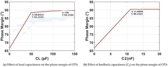 Figure 19 illustrates the effect of the load capacitor () and feedback capacitor () on the phase margin of the OTA. As the load on the feedback capacitor increases, the phase margin only improves. To improve the predictability of the OTA behavior, a fixed capacitor at an internal load of 1 pF is incorporated into the layout design.