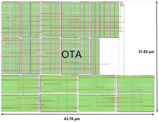 The proposed OTA in Figure 2 is designed using the method [49]. The aspect ratios (W/L) of various devices are given in Table 1. Device lengths are selected to be longer than the minimum process channel length (45 nm) in order to lessen the channel length modulation effect. For low-power operation, this work presents all devices functioning in the subthreshold region, which is indicated by region 3 in Cadence software (https://www.cadence.com/en_US/home.html).