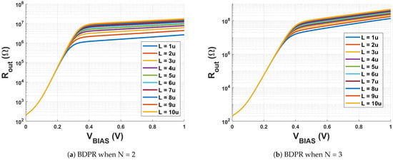 where is the body-effect coefficient, typically ranging from 0.1 to 0.3 [48]. As both the transistors are identical, . The generalized output resistance equation for N = 2 (N devices in series) can be written as in Equation (25).