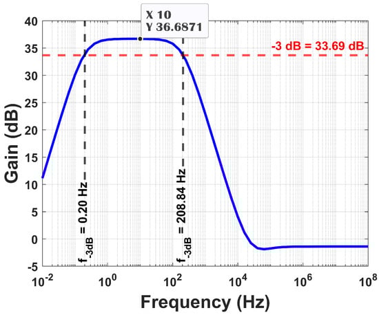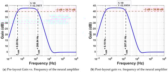 Figure 18a shows the gain vs. frequency plot when the supply voltage is deviated by ∼. The simulation’s outcome demonstrates that the gain’s deviation is minimal. This demonstrates how reliable the design is. Figure 18b shows that the gain decreases as the temperature rises. The sensitivity to temperature is touted as a demerit when considering applications for neural signal processing. A deviation of <% in gain (dB) is observed when the temperature is between −40 °C and 80 °C.