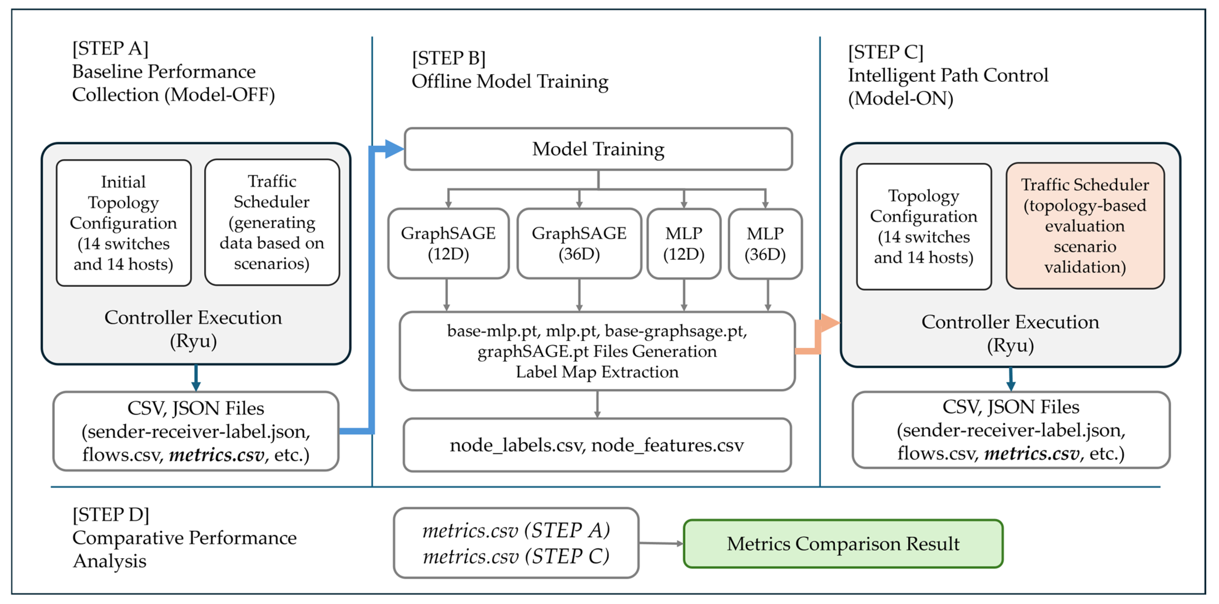Through [STEP B], four models were trained, and their performance was compared using evaluation metrics such as F1-score, AUC, and Accuracy. The generated model files (gsage.pt and mlp.pt) were subsequently utilized in [STEP C], where they were deployed in the SDN controller to control the routing of newly generated traffic.