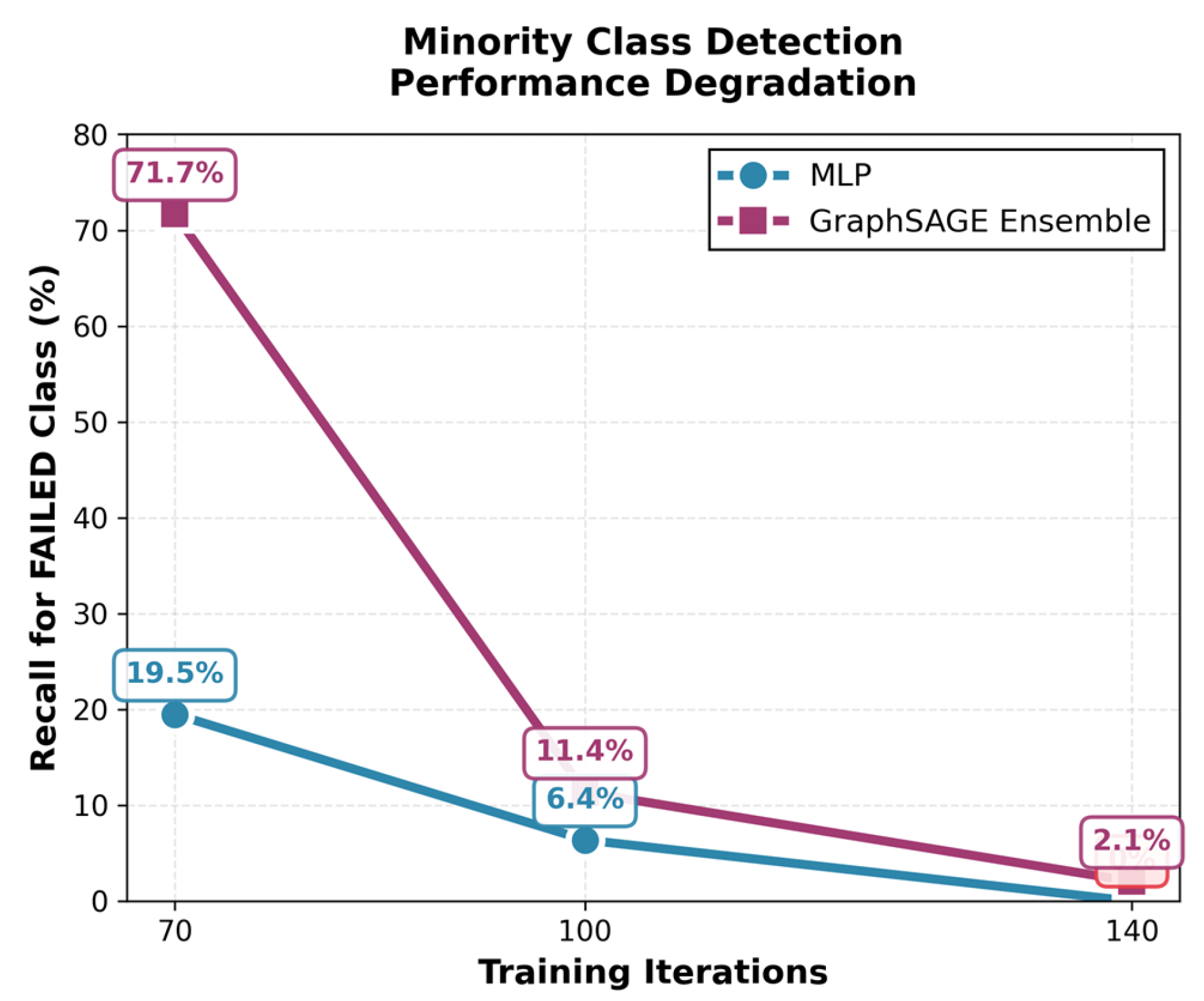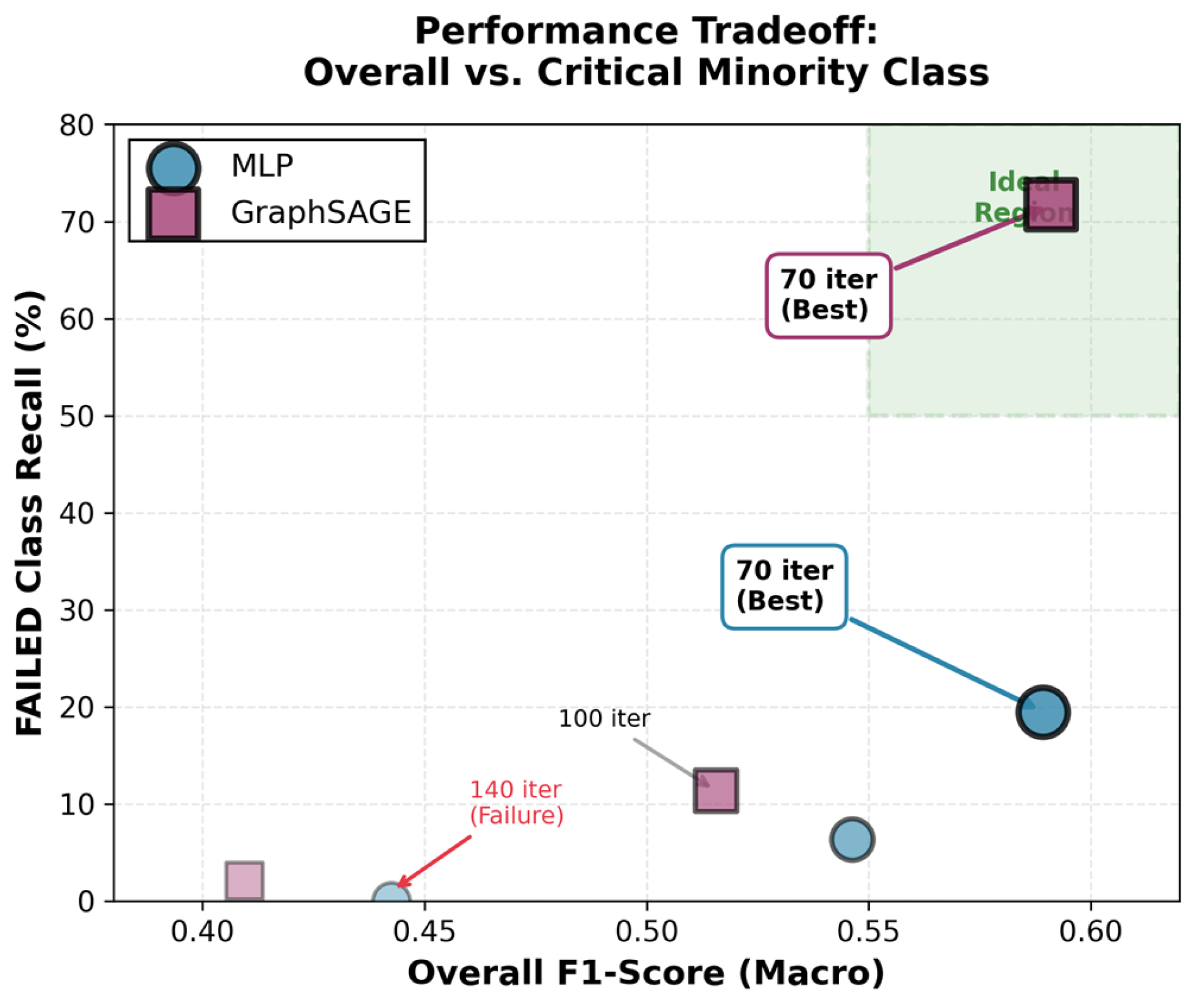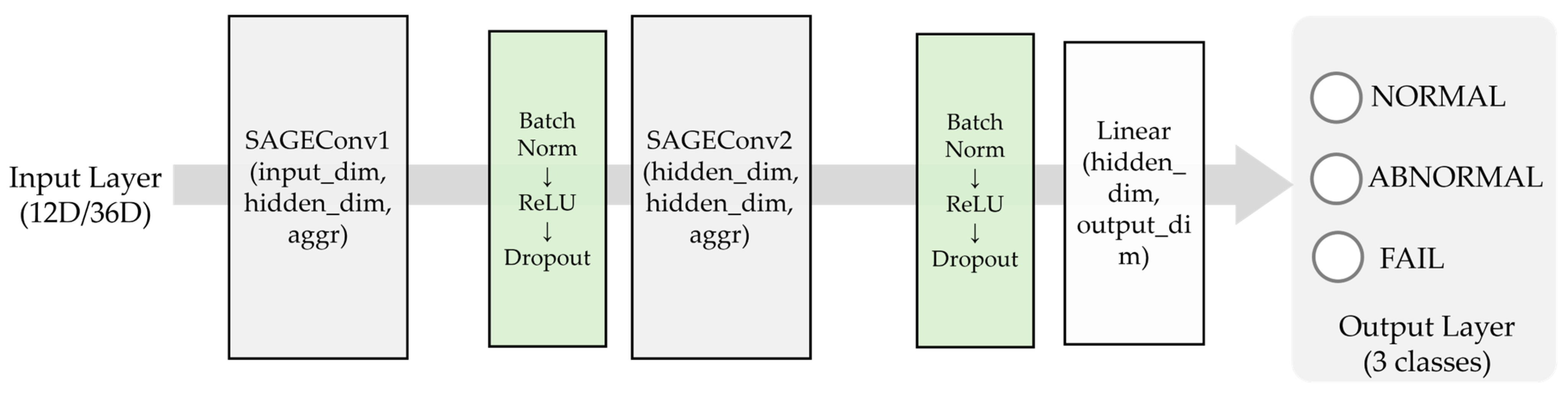 In [STEP B], the classification performance of the offline-trained MLP and GraphSAGE models was evaluated using the metrics described below. Since the dataset used in this study is highly imbalanced, with a ratio of NORMAL:ABNORMAL:FAIL = 2:2:6, the use of accuracy alone may distort the actual model performance. Therefore, the following metrics [