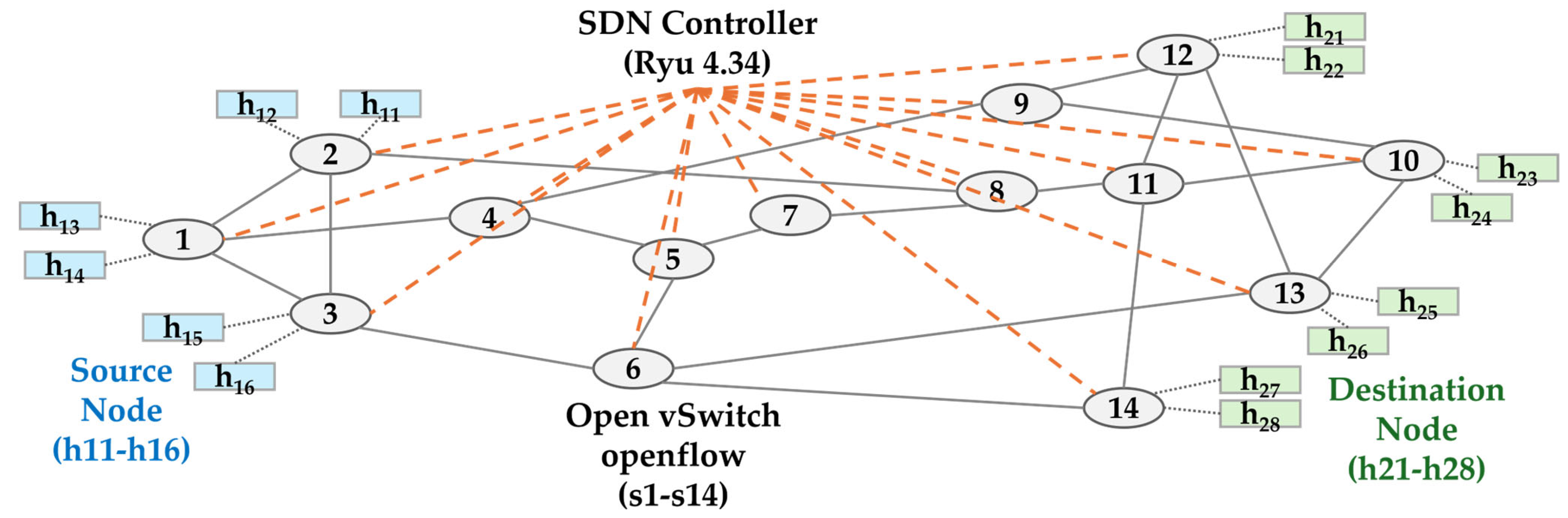 The topology consists of 14 OpenvSwitch (s1–s14) and 14 hosts (h11–h28), which were created in the Mininet environment. All switches (s1–s14) in the topology are managed by the SDN controller (Ryu 4.34) through the OpenFlow 1.3 protocol. The hosts are divided into source nodes (h11–h16), which generate traffic, and destination nodes (h21–h28), which receive traffic. Each host is connected to a specific switch, as shown in