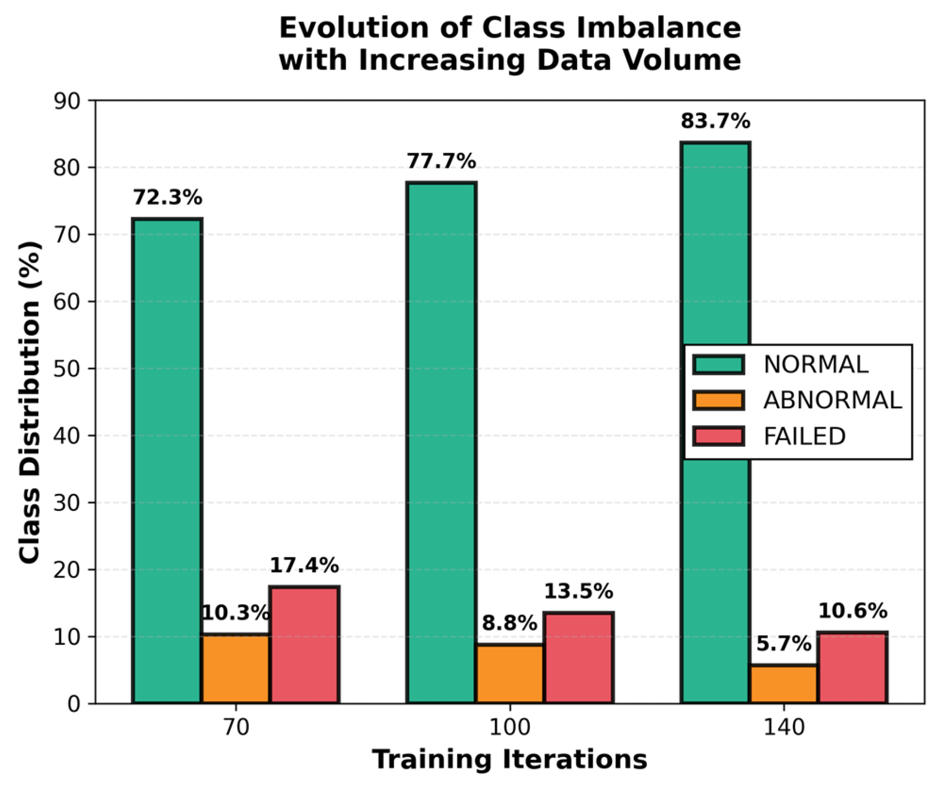 In this study, although we intended to collect NORMAL, ABNORMAL, and FAIL scenarios at a ratio of 2:2:6, the actually collected samples were overwhelmingly dominated by the NORMAL class. As the number of data collection iterations increased, the absolute number of NORMAL samples grew faster than other classes, further exacerbating the class imbalance. This caused the model to be biased toward the NORMAL class during training, resulting in a degradation of minority class detection capability.