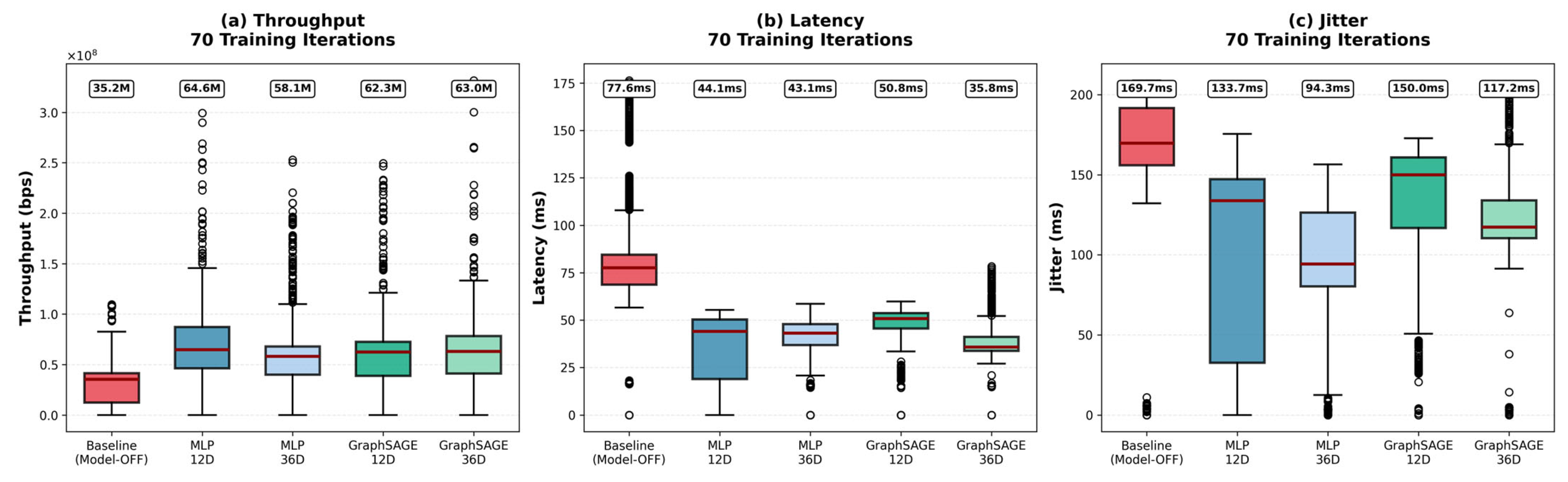 Additionally, although the MLP’s average throughput was somewhat high, its control performance was inconsistent due to large variance and numerous outliers. However, GraphSAGE showed slightly lower average throughput but demonstrated overall stable and predictable control performance with small fluctuations in latency and jitter and fewer outliers, confirming the performance stability of the GraphSAGE model.