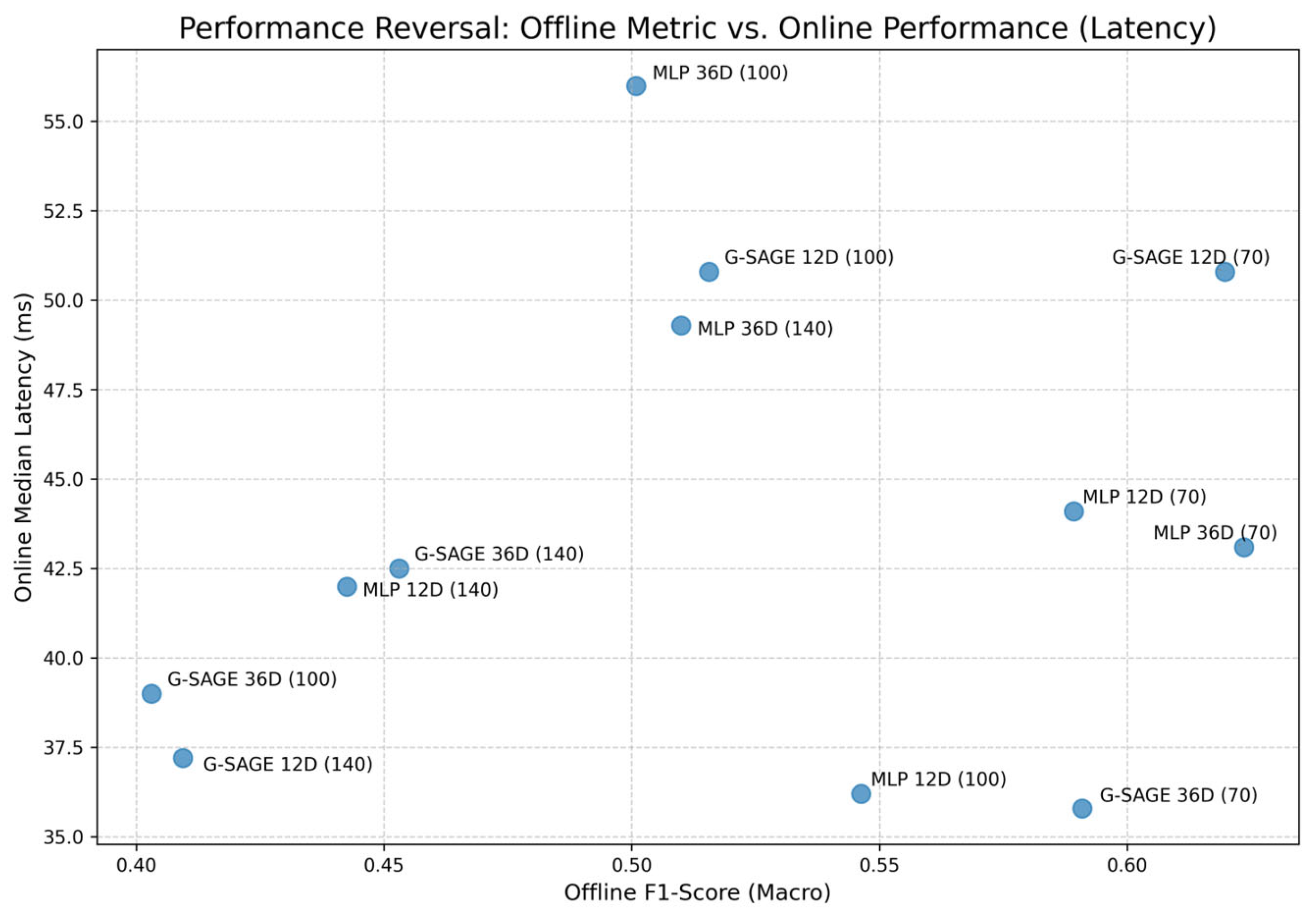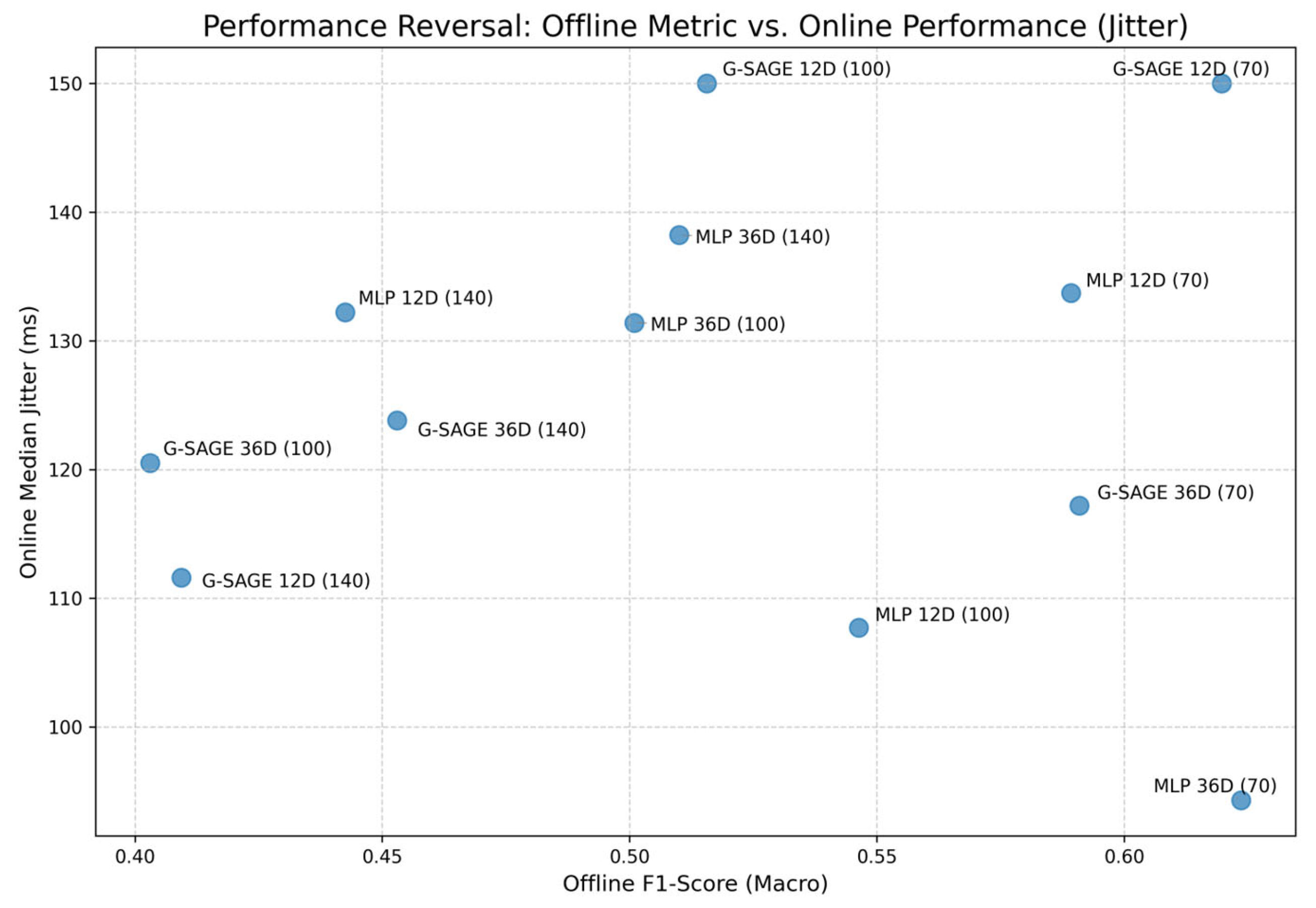 To quantitatively verify the performance-reversal phenomenon observed in this study, a Pearson correlation analysis was conducted between the offline F1-score and the online performance indicators. The results showed that the correlations between the offline F1-score and the online metrics were not statistically significant—latency (r = 0.1912, p = 0.5517) and jitter (r = 0.0072, p = 0.9824).