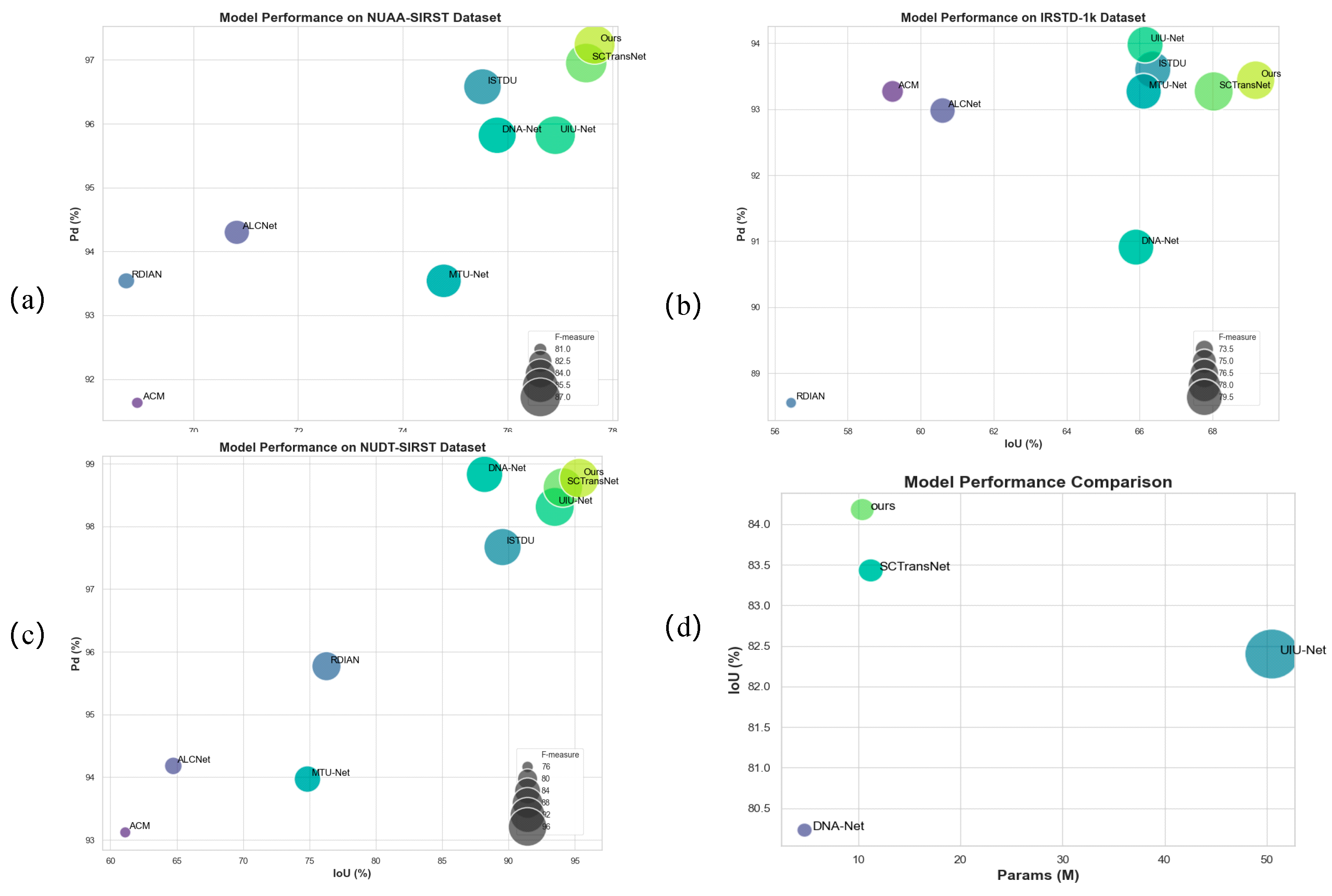 On the NUAA-SIRST dataset, MixMambaNet achieves the highest scores in mIoU (77.66%), nIoU (82.00%), and Probability of Detection (Pd) at 97.24%. This indicates a remarkable capability in both accurately segmenting the target shape and successfully identifying its presence. While its F-measure (87.17%) is marginally second to SCTransNet (87.32%), its superior IoU scores highlight a more precise pixel-level prediction.
