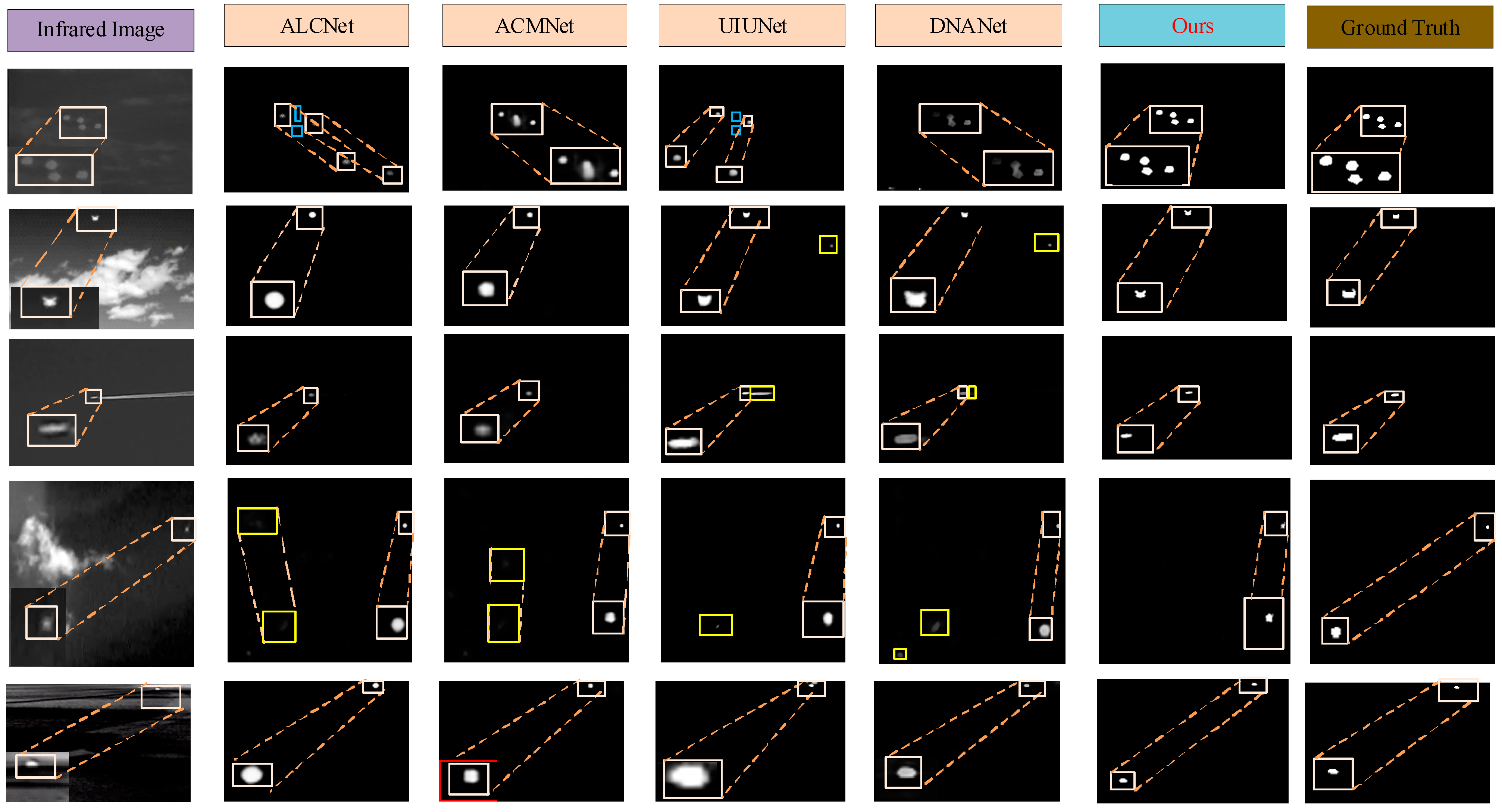 Figure 7 presents a visual comparison of the detection results produced by the proposed MixMambaNet and four representative infrared small target detection models (ALCNet, ACMNet, UIU-Net, DNANet) under highly challenging scenarios. The selected scenes contain diverse difficulties, including low signal-to-noise ratio (SNR), multiple closely spaced targets, and strong background clutter interference. From the results, ALCNet and ACMNet frequently miss faint targets (blue boxes) or misclassify background noise as targets (yellow boxes). UIU-Net demonstrates partial improvement, but still suffers from missed detections in extremely weak signal cases, as visible in the first and second rows. DNANet achieves cleaner segmentation masks but occasionally fails to suppress clutter, leading to false alarms in complex textures. In contrast, MixMambaNet consistently detects all genuine targets (white boxes) with precise segmentation masks that closely match the ground truth, while maintaining effective suppression of high-frequency background noise. This visual evidence reinforces our quantitative evaluation, confirming that MixMambaNet excels at enhancing target saliency while mitigating interference from challenging infrared backgrounds.