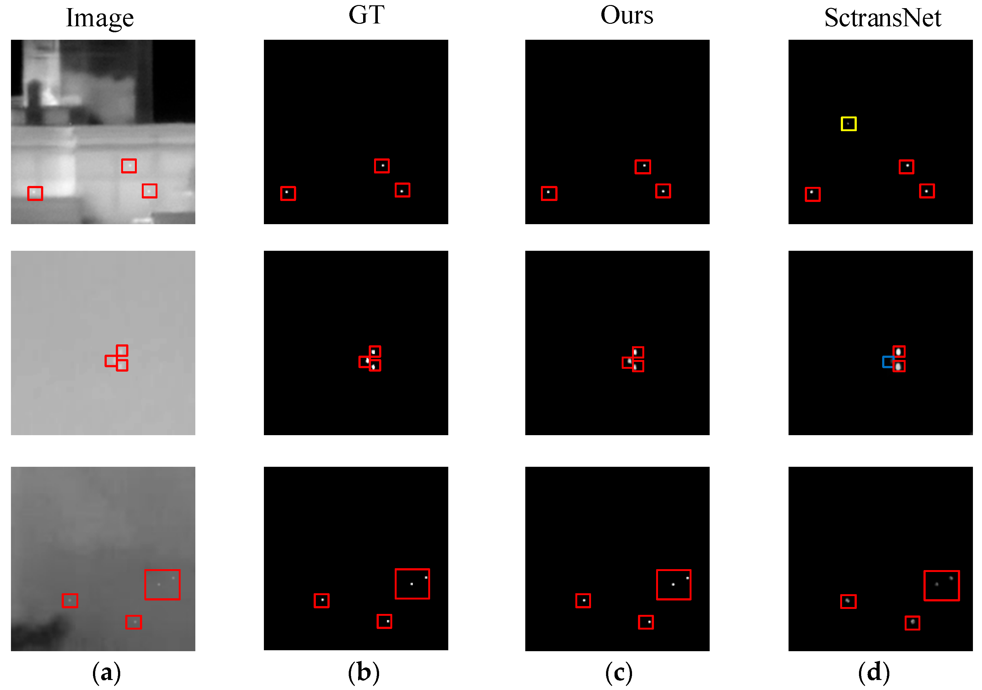 Row 1 (Building Scene): This scene features multiple small targets positioned near the sharp, high-contrast edges of a building structure. While both models successfully identify all genuine targets, SCTransNet produces a false alarm (indicated by the yellow box), misinterpreting the strong edge features as a target. In contrast, MixMambaNet achieves flawless detection, accurately identifying all targets with zero false positives. This result highlights our model’s superior ability to differentiate true targets from structured background clutter, such as building edges.