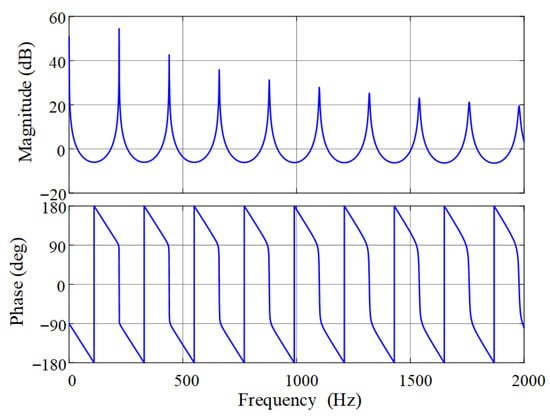 Additionally, is a phase-lead filter, employed to enhance system stability. In this control scheme, denotes an N-step delay, where . Here, represents the sampling frequency, and is the fundamental frequency of the perturbation signal. The RC introduces poles near the fundamental frequency and its integer multiples. As a result, the magnitude response of the RC exhibits peaks at these frequencies, thereby enabling precise tracking of multi-frequency sinusoidal signals.