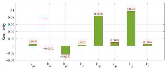 Based on this control strategy, the sensitivity of the dominant poles to various parameters is analyzed in Figure 4. Sensitivity is defined as the per-unit value of the variation in the modulus of the dominant pole divided by the per-unit value of the variation in the parameter. Figure 4 analyzes the degree of influence of each control parameter in the SVG controller and the grid inductance on the dominant poles. The control parameters include the proportional gain and integral gain of the voltage control loop, the proportional gain and integral gain of the current control loop, the proportional gain and integral gain of the PLL, and the proportional gain of FORC. As shown in the figure, the primary factors influencing the dominant poles are and , while has a relatively minor impact. This indicates that FORC exhibits favorable robustness in terms of parameter adjustment, and variations in its parameters do not significantly affect the stability of the system.