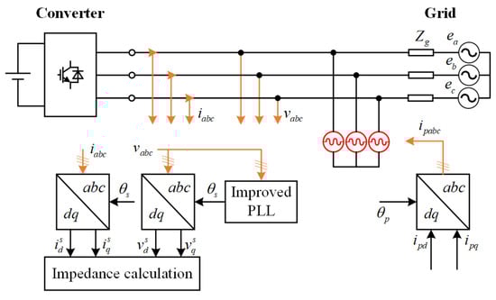 The output impedance or admittance of the power converters is a crucial parameter for identifying the state of the system. The three-phase converter shown in Figure 5 is widely utilized in distributed energy systems. is the three-phase voltage at the PCC, and refers to the output current. The converter adopts a current control strategy and utilizes a PLL to maintain phase synchronization between the output current and the PCC voltage. The controller is implemented in the dq domain, where PI controllers are used to track the reference signal, and pulse width modulation (PWM) is used to generate control signals.