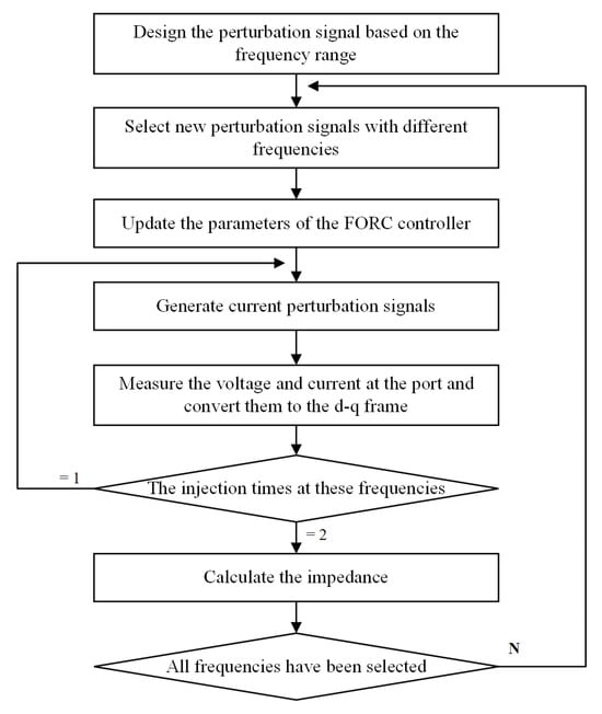 Based on the control strategy and measurement method, the impedance measurement process is illustrated in Figure 8. Initially, the reference value of the perturbation signal is designed. Subsequently, the control parameters of the FORC are updated based on this reference value. Specifically, the order of the delay link and the coefficients of the Lagrange interpolation formula are determined according to the fundamental frequency of the reference value, as given in (4). Next, two independent disturbance currents are injected into the system. The three-phase voltage and current data at the test port are then collected and transformed into the d-q coordinate system. Finally, the components of the voltage and current signals in the d-q coordinate system at the disturbance frequencies are extracted, and the impedance at these frequencies is calculated. By iterating through the perturbation signals across all frequencies and repeating the aforementioned steps, the wideband impedance of the system under test can be obtained.