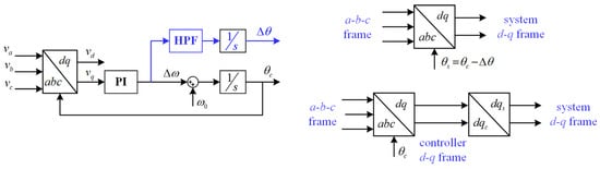 The structure of the PLL is depicted in Figure 9, and the output is the phase angle of the controller d-q frame, denoted by . To track grid fluctuations, the bandwidth of the PLL needs to be sufficiently high. This, however, may result in a difference between the angles of the two d-q frames [19], denoted as , due to the injected disturbance. It can be shown that the relationship between the angles of the two frames is as follows: