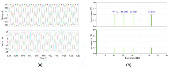 First, the SVG’s capability in controlling perturbation signals is verified. In this test, the reference frequencies of the perturbation signals are set to 10.4 Hz, 15.6 Hz, 20.8 Hz, and 31.2 Hz, while the amplitudes of the d-axis and q-axis perturbation signals are set as 1 A and 0.5 A, respectively. As shown in Figure 10a, the waveforms of the voltage and output current of the SVG are shown. The current waveforms lag the voltage waveforms by , indicating that the SVG delivers a purely reactive power of 9 kvar. In addition to the fundamental frequency component, the voltage and current signals also contain small-signal disturbances at multiple frequencies. The frequency spectra of the d-axis and q-axis current signals are presented in Figure 10b. It can be observed that the frequencies and amplitudes of these small-signal perturbations closely match the reference values.