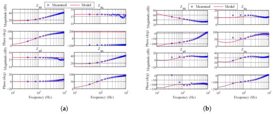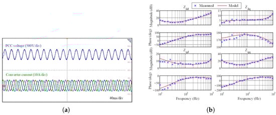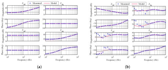 The equivalent impedance of each port can be calculated based on the voltage and current response signals at each port in the system. For the system illustrated in Figure 3a, the impedances of the load and the converter are measured. Figure 11a presents the impedance measurement results of the load, where the red curve denotes the theoretical impedance model and the blue dots represent the measured results. The results show good agreement.