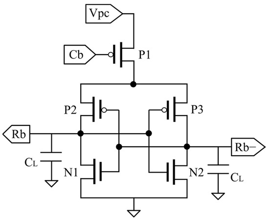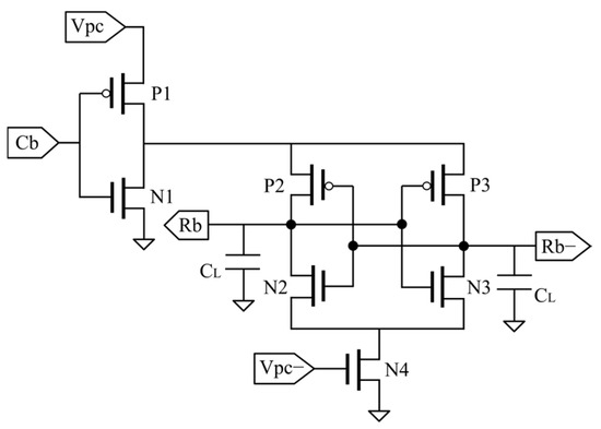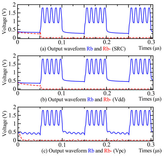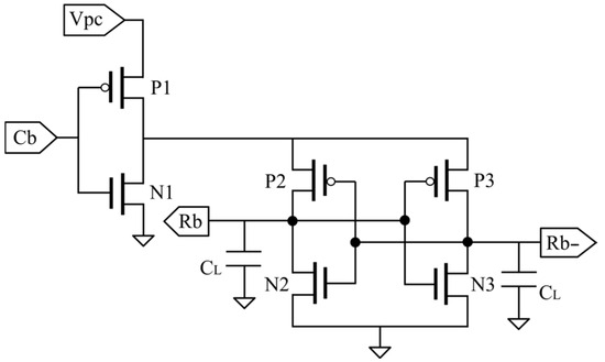 The trapezoidal Vpc consists of four phases: Wait, Evaluate, Hold, and Recover, as illustrated in the timing chart in Figure 3. When Cb is set to logic “0”, if P2 conducts first, the output Rb is charged by Vpc and discharges back toward Vpc, with its waveform following the Vpc signal, whereas Rb− discharges to ground and stays at logic “0”.