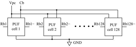 To evaluate its performance, the proposed PUF is designed as a 128-bit circuit, as shown in Figure 6, where all 128 bit cells are controlled by a single challenge bit and powered by the common power clock Vpc. Each bit cell operates independently, and its initial logic state (“0” or “1”) is determined by intrinsic transistor mismatches within the SRAM cell due to the uncontrollable process variations. Consequently, each bit shows a random value among different devices but remains stable within the same device across multiple evaluations. All output bits Rb form a 128-bit response that forms a random pattern. This pattern is device-specific and can be extracted from the PUF only when required. For each Cb input, the PUF instance produces 128 response bits that serve as a unique device fingerprint and can be used for secure key generation.