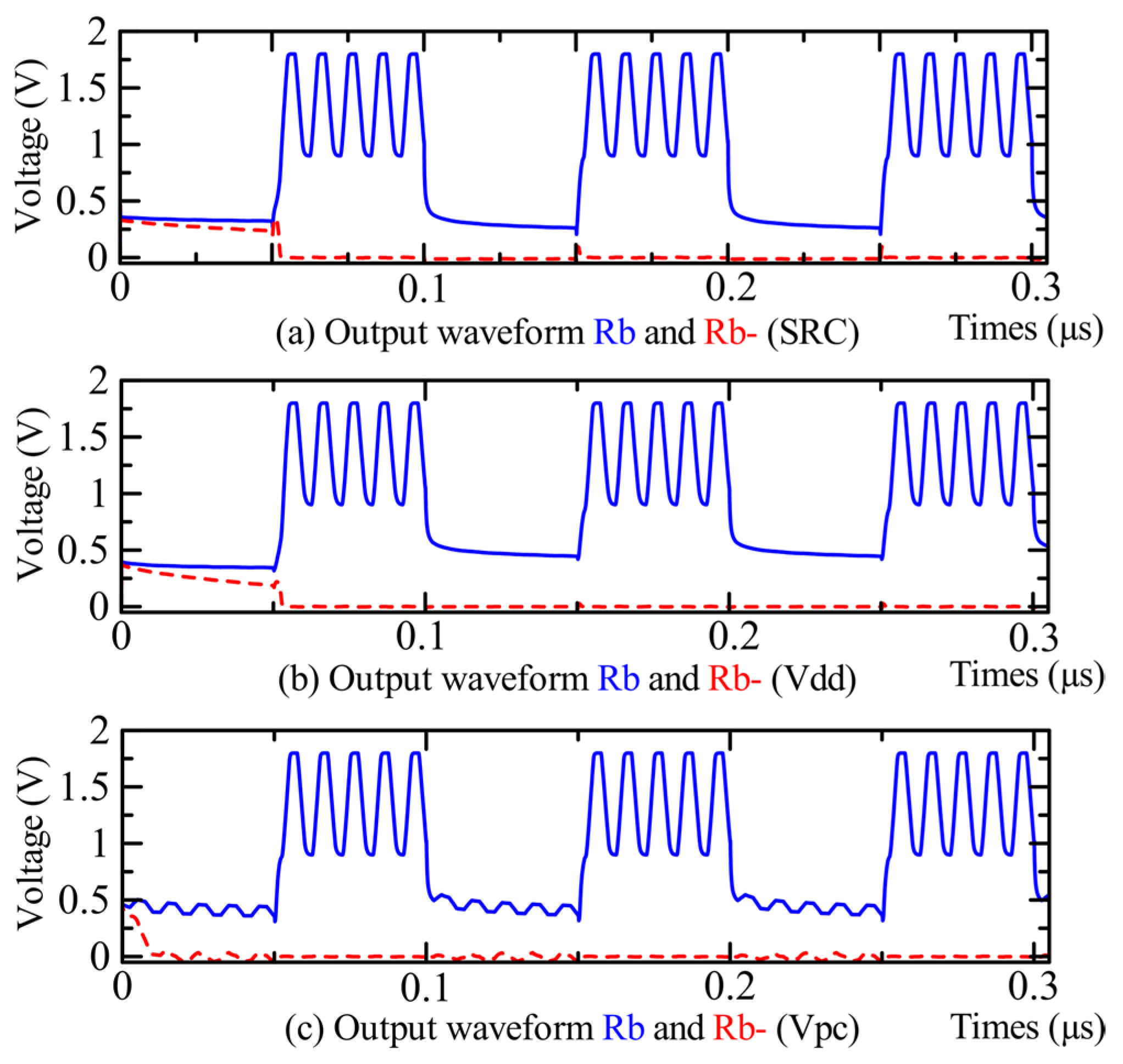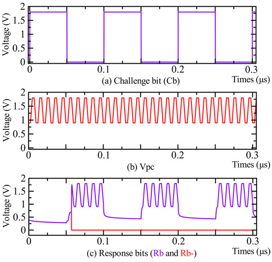 Figure 7 illustrates the waveforms of Cb, Vpc, and the outputs (Rb and Rb−) of the proposed PUF. The PUF operates when Cb is set to logic “0” and functions across four phases, as described previously. The output Rb follows the waveform of Vpc and reaches logic “1”, while Rb− remains at logic “0”. When Cb is set to logic “1”, the PUF operation stops. The PUF cell enters the idle state, and Rb discharges to ground to become logic “0”.