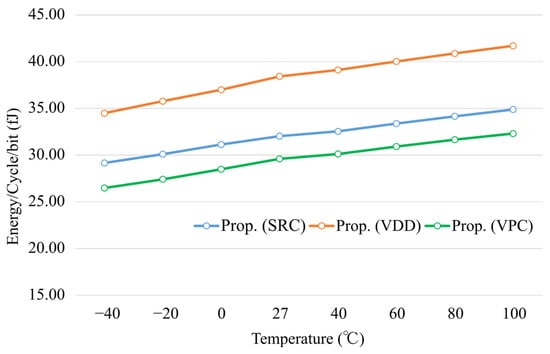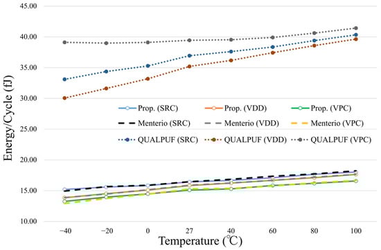As depicted in Figure 8, at a reference temperature of 27 °C and with the body connected to the source, the proposed 128-bit PUF consumes an average of 16.43 fJ per bit per Cb-cycle, resulting in a total energy dissipation of 2103.45 fJ. For the other body connections, the PUF consumes 15.84 fJ per bit (2027.70 fJ in total) when the PMOS body is connected to Vdd, and 15.10 fJ per bit (1932.27 fJ in total) when connected to Vpc. Regardless of temperature variations, connecting the body to Vpc consistently results in lower energy dissipation than connecting it to Vdd or the source. Compared with QUALPUF, the proposed PUF achieves a reduction of approximately 55% in energy dissipation when the body is connected to the source or Vdd, and over 60% when connected to Vpc. Furthermore, the energy dissipation is comparable to that of the ultra-low-power design under all three body connections, demonstrating that the proposed PUF achieves low-energy dissipation while using fewer transistors. Compared with QUALPUF, which uses a 0–1.8 V power clock, the ultra-low-power and proposed PUF designs use a 0.9–1.8 V power clock. This limits the voltage drop during the discharging phase to 0.9 V instead of 0 V, reducing the energy dissipated during discharging phase. Furthermore, as the voltage ramps from 0.9 V to 1.8 V over the same time period as 0 to 1.8 V, the slower charging, according to the adiabatic principle, reduces energy dissipation, and the smaller charging current, due to the reduced voltage swing, together contribute to lower energy dissipation.