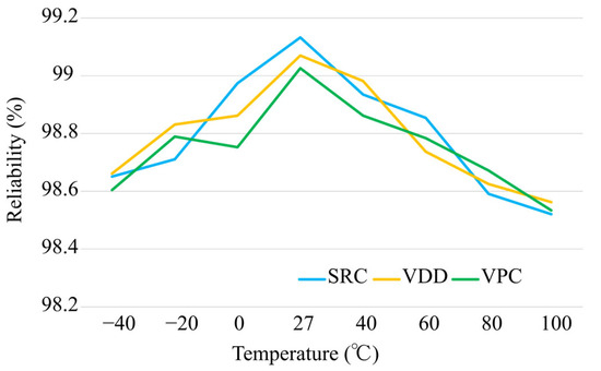 Reliability is assessed by the proportion of times the same PUF outputs the same response bits under the effect of varying operating conditions, such as different ambient temperature or variations in supply voltage. Since the response bits serve as the unique identity bits of each PUF, reliability evaluates the reproducibility of PUFs. The ideal value for reliability is 100%, and the value is calculated by