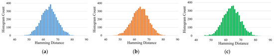 Distribution of Hamming distance of the proposed PUF: (a) With the body connected to the source; (b) With the body connected to Vdd; (c) With the body connected to Vpc.