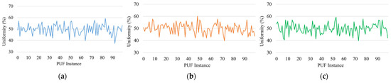 Uniformity indicates whether the response bits of a PUF instance show a balance between logic “1” and “0” in nearly equal proportion. It indicates the randomness of a PUF and is calculated as the Hamming Weight (HW) divided by the bit length, or simply as the percentage of logic “1”s. The ideal value for uniformity is 50%. The average uniformity over k PUF instances is calculated by