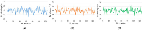 Bit-aliasing evaluates whether the same bit position among different PUFs tends to generate identical values. It indicates whether a bit position is balanced across different PUFs and is calculated as the Hamming weight of the l-th bit among k devices divided by k. The ideal value of bit-aliasing is 50%. The average bit-aliasing across n bit positions is calculated as