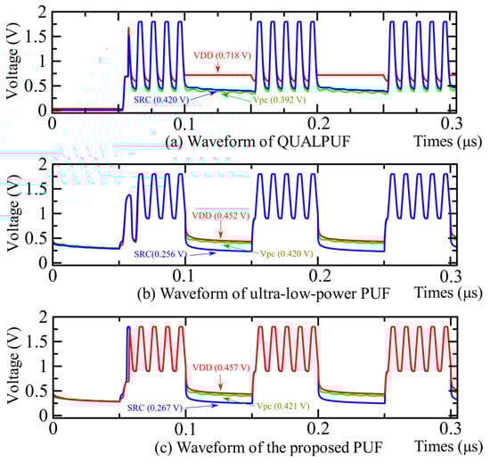 To address these issues, we remove the additional power clock Vpc− and the NMOS transistor driven by Vpc−. Figure 15 depicts the output waveforms of conventional PUFs and the proposed PUF. As shown in Figure 15b,c, even without Vpc−, the proposed PUF output reaches approximately the same voltage level as the ultra-low-power PUF under all three body connections. Furthermore, according to the energy dissipation results in Figure 8, without the additional phase of the power clock, the proposed PUF consumes a similar energy level to the ultra-low-power PUF. These results indicate that even when removing the additional Vpc− and its corresponding NMOS transistor, the PUF maintains its superior performance while reducing implementation area.