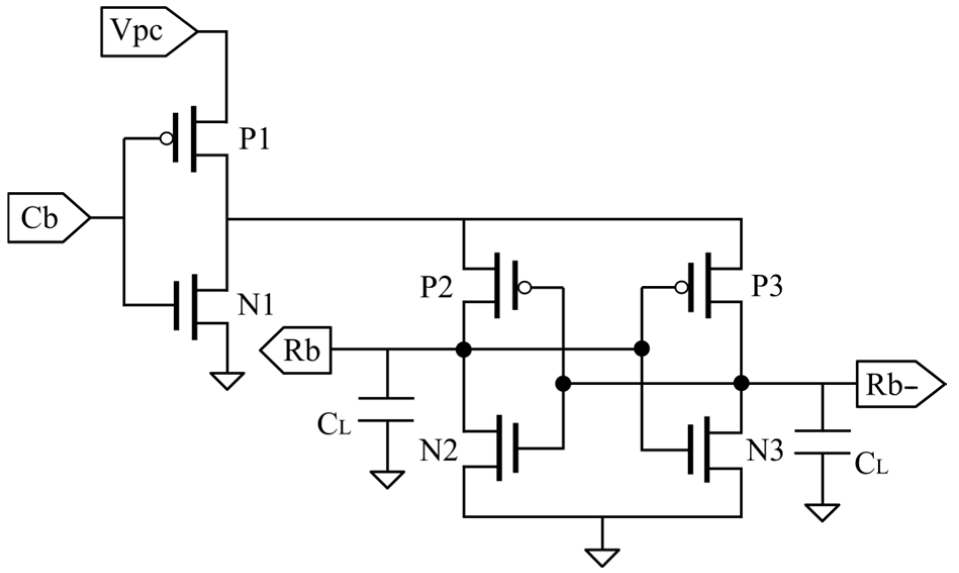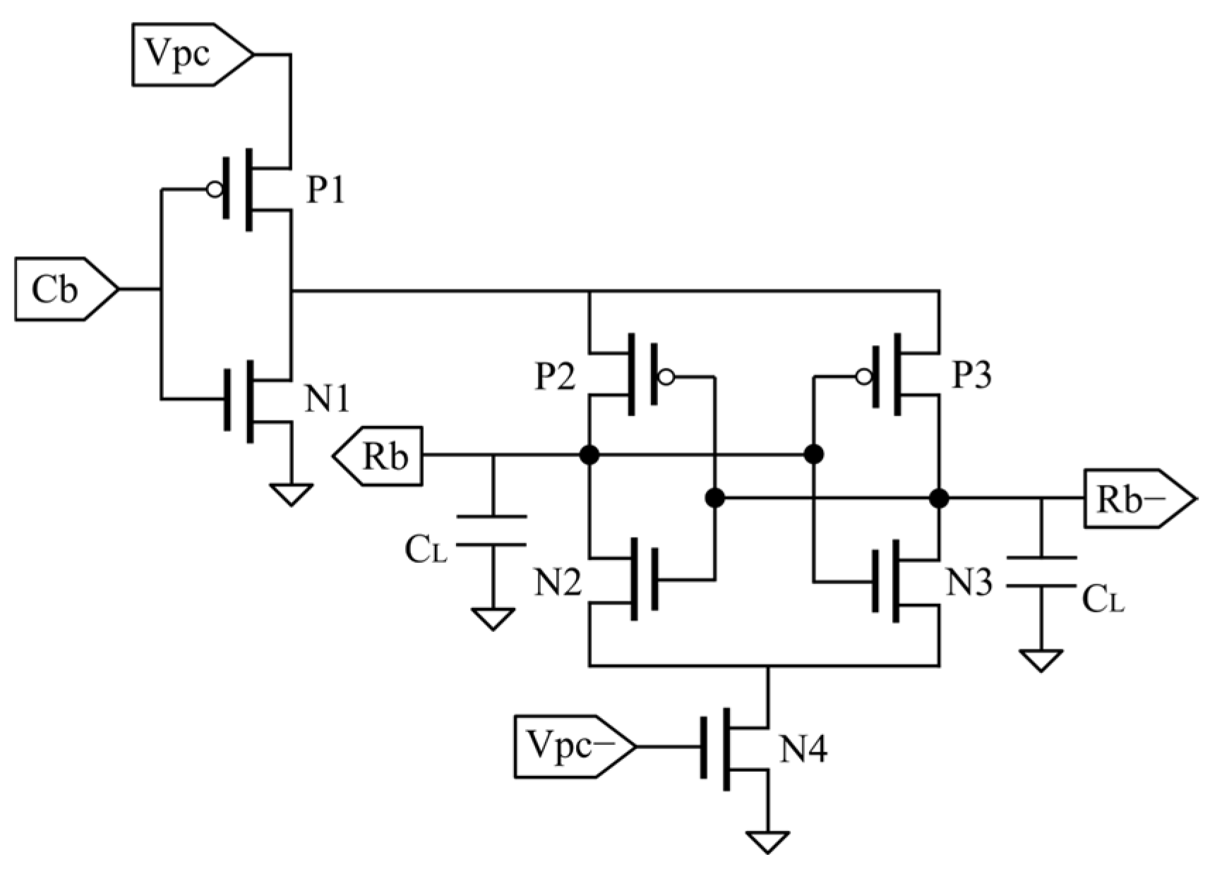 Figure 3. When Cb is set to logic “0”, if P2 conducts first, the output Rb is charged by Vpc and discharges back toward Vpc, with its waveform following the Vpc signal, whereas Rb− discharges to ground and stays at logic “0”.