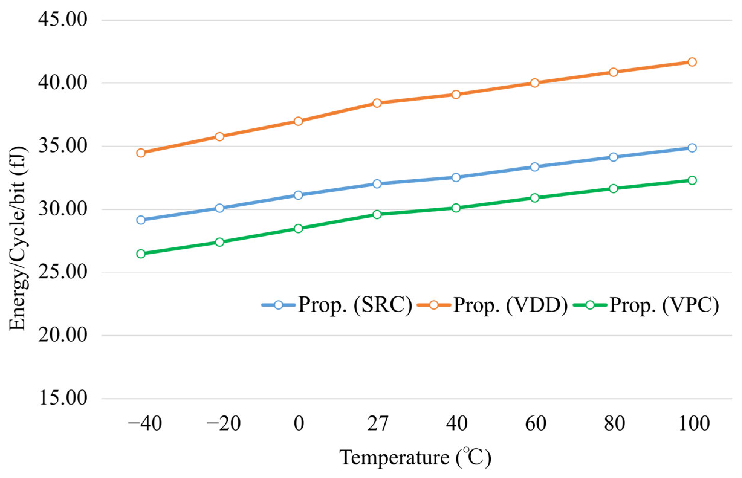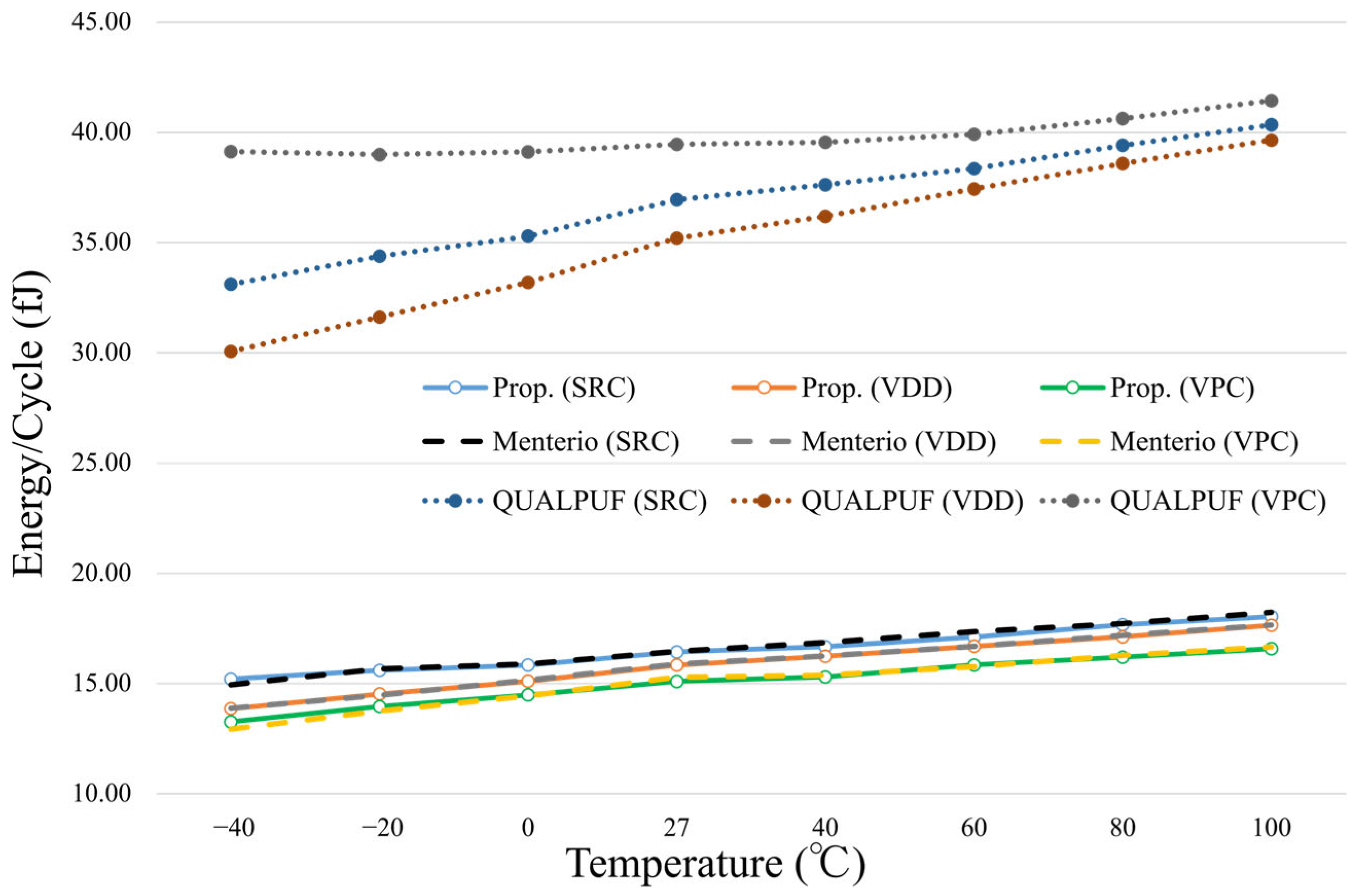 Figure 8, at a reference temperature of 27 °C and with the body connected to the source, the proposed 128-bit PUF consumes an average of 16.43 fJ per bit per Cb-cycle, resulting in a total energy dissipation of 2103.45 fJ. For the other body connections, the PUF consumes 15.84 fJ per bit (2027.70 fJ in total) when the PMOS body is connected to Vdd, and 15.10 fJ per bit (1932.27 fJ in total) when connected to Vpc. Regardless of temperature variations, connecting the body to Vpc consistently results in lower energy dissipation than connecting it to Vdd or the source. Compared with QUALPUF, the proposed PUF achieves a reduction of approximately 55% in energy dissipation when the body is connected to the source or Vdd, and over 60% when connected to Vpc. Furthermore, the energy dissipation is comparable to that of the ultra-low-power design under all three body connections, demonstrating that the proposed PUF achieves low-energy dissipation while using fewer transistors. Compared with QUALPUF, which uses a 0–1.8 V power clock, the ultra-low-power and proposed PUF designs use a 0.9–1.8 V power clock. This limits the voltage drop during the discharging phase to 0.9 V instead of 0 V, reducing the energy dissipated during discharging phase. Furthermore, as the voltage ramps from 0.9 V to 1.8 V over the same time period as 0 to 1.8 V, the slower charging, according to the adiabatic principle, reduces energy dissipation, and the smaller charging current, due to the reduced voltage swing, together contribute to lower energy dissipation.