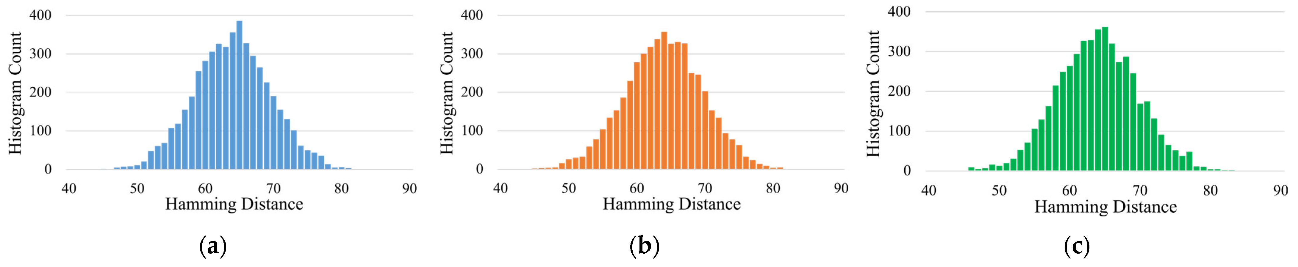 Figure 10a–c present the HD distributions corresponding to the source, Vdd, and Vpc body connections, respectively. The mean HD values for the three connections are 63.90, 63.96, and 63.89, illustrating the distribution of HD across 100 simulated instances. The proposed PUF achieves high uniqueness close to the ideal value across all three body connections. The average uniqueness values are 49.92%, 49.97%, and 49.91% when the body is connected to the source, Vdd, and Vpc, respectively. These metrics across all three body connections indicate that each response bit has an approximately equal probability of being logic “0” or “1”, resulting from uncontrollable intrinsic variations. These results demonstrate that the proposed PUF can reliably generate unique identifiers under different body connection conditions.