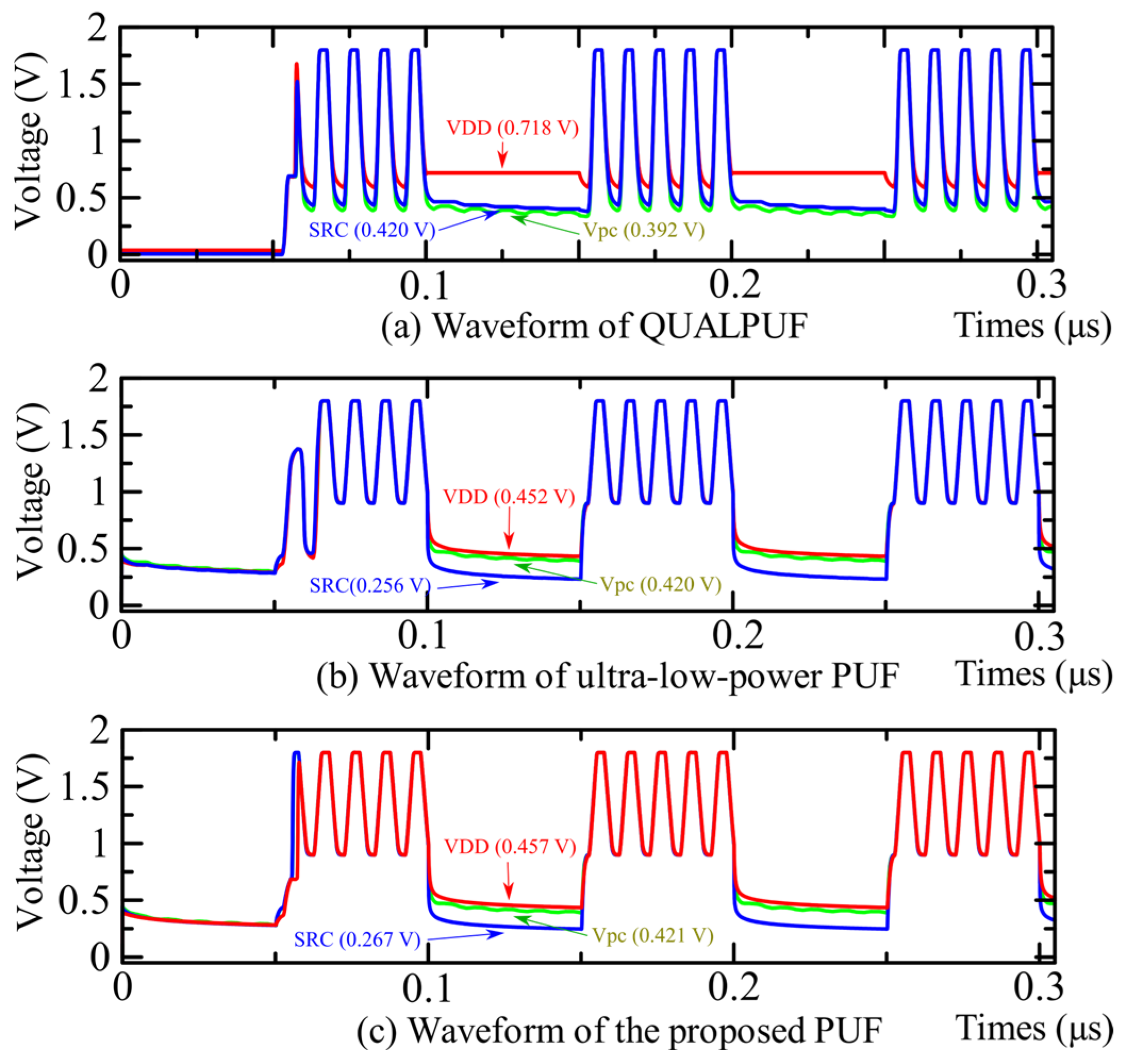 Figure 15 depicts the output waveforms of conventional PUFs and the proposed PUF. As shown in