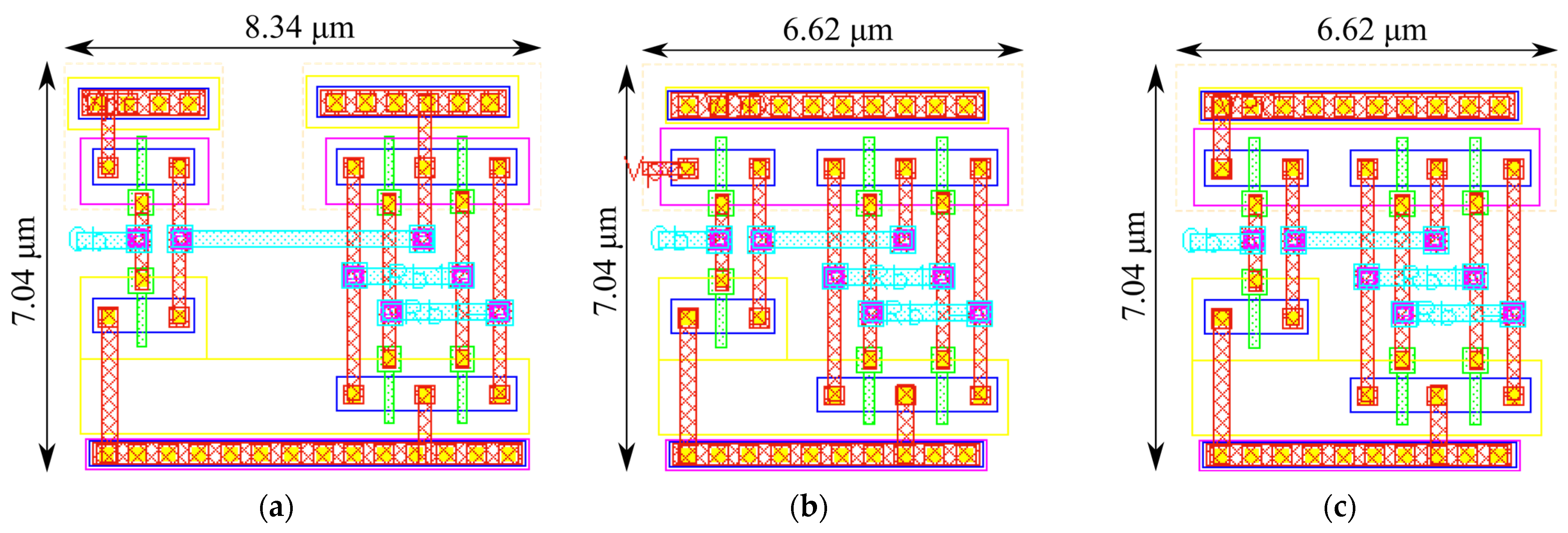 Figure 14, the Vpc connection consistently shows the lowest energy among all three body connections, while the Vdd connection consumes the highest energy in the post-layout results. Although the layout structures of the Vpc and Vdd connections are almost identical, the energy dissipation of the Vdd connection is more influenced by parasitic capacitances and the routing of power signals. Therefore, the Vpc body connection is preferred in this design.