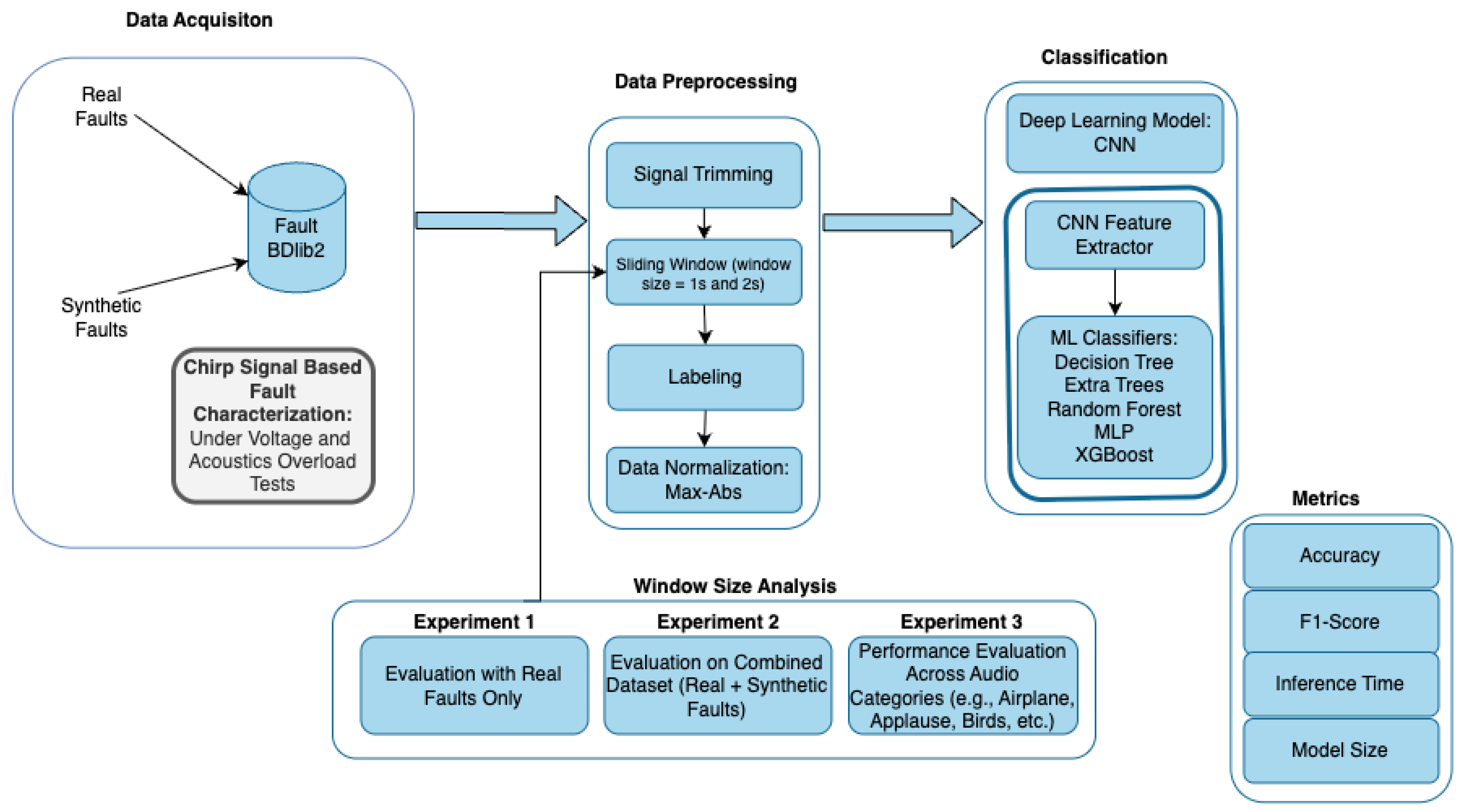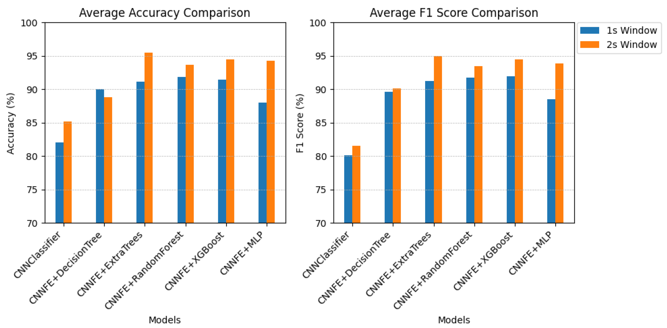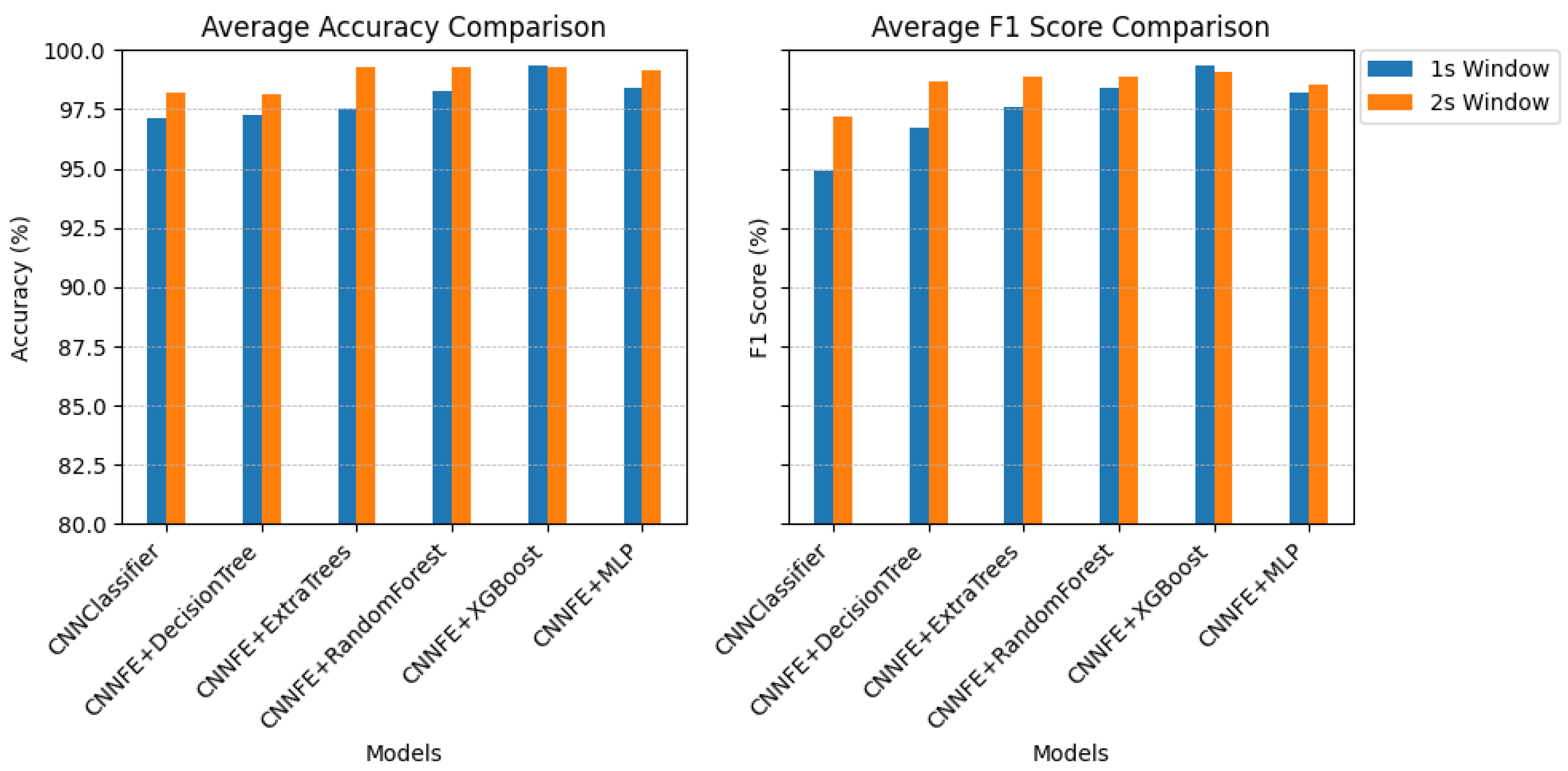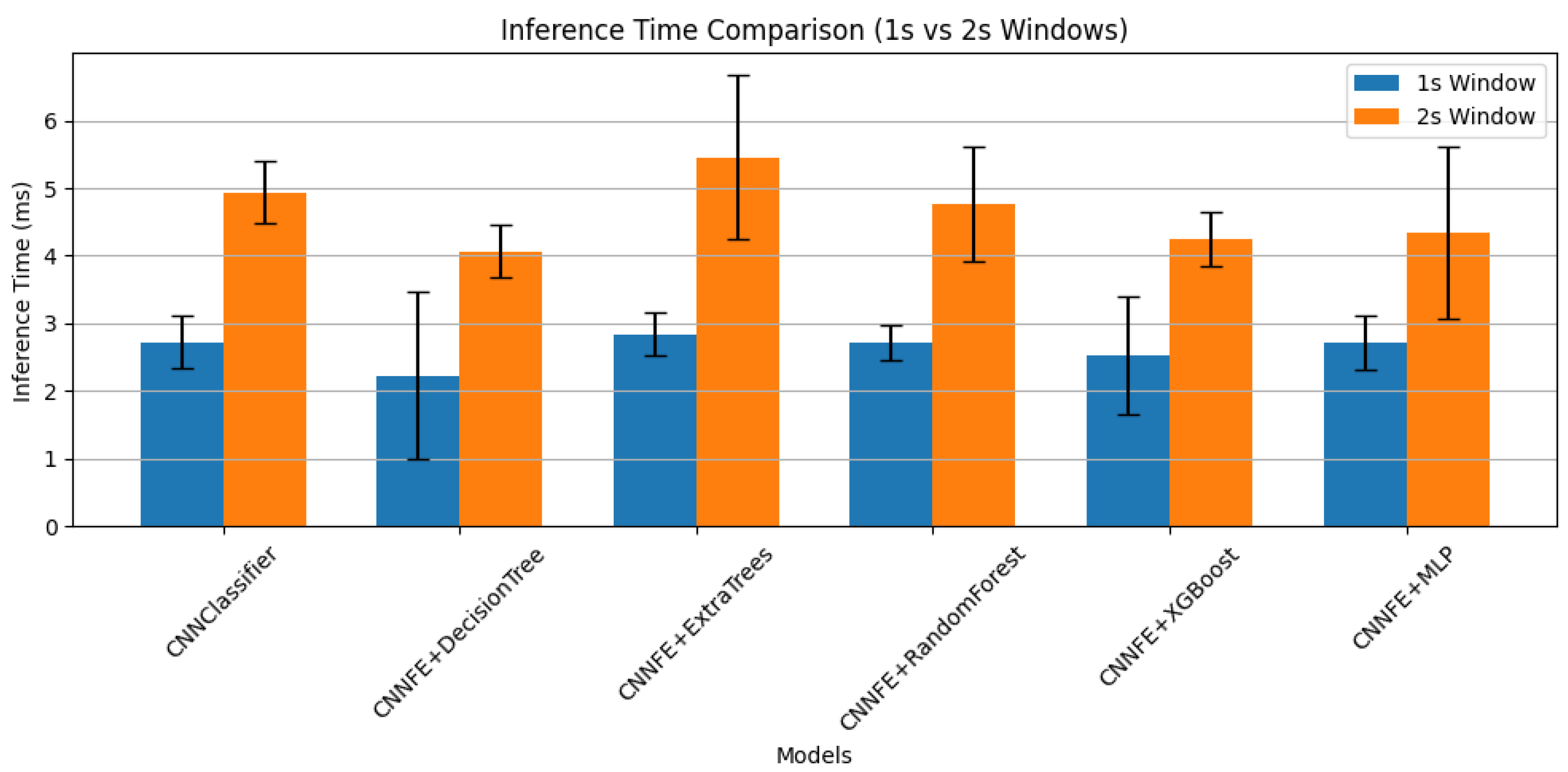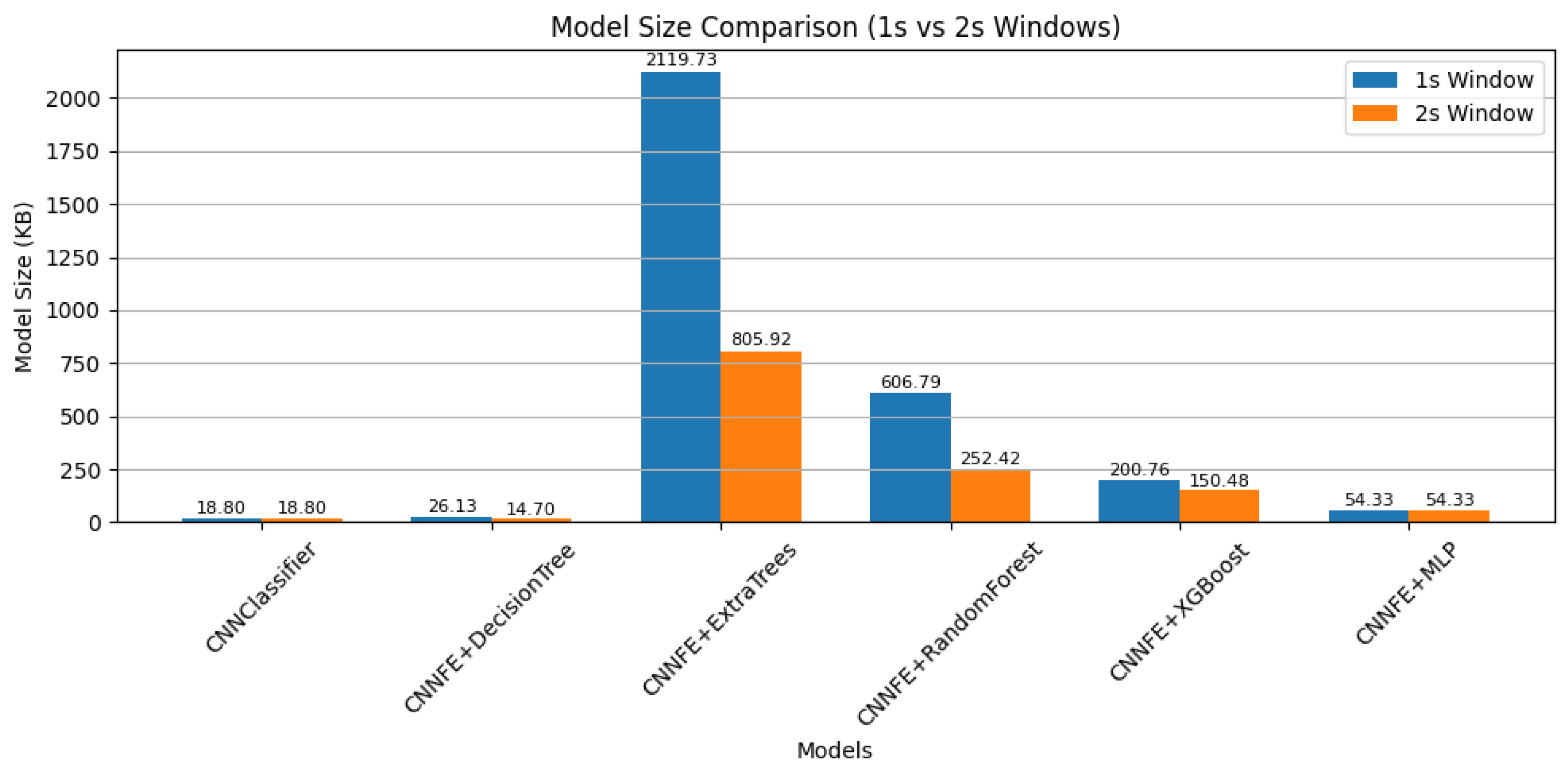 - A sensor fault classification pipeline was developed using both deep learning and classical ML models. The impact of different window sizes (1 s and 2 s) on model performance, including accuracy, F1-score, inference time, and model size, was evaluated.