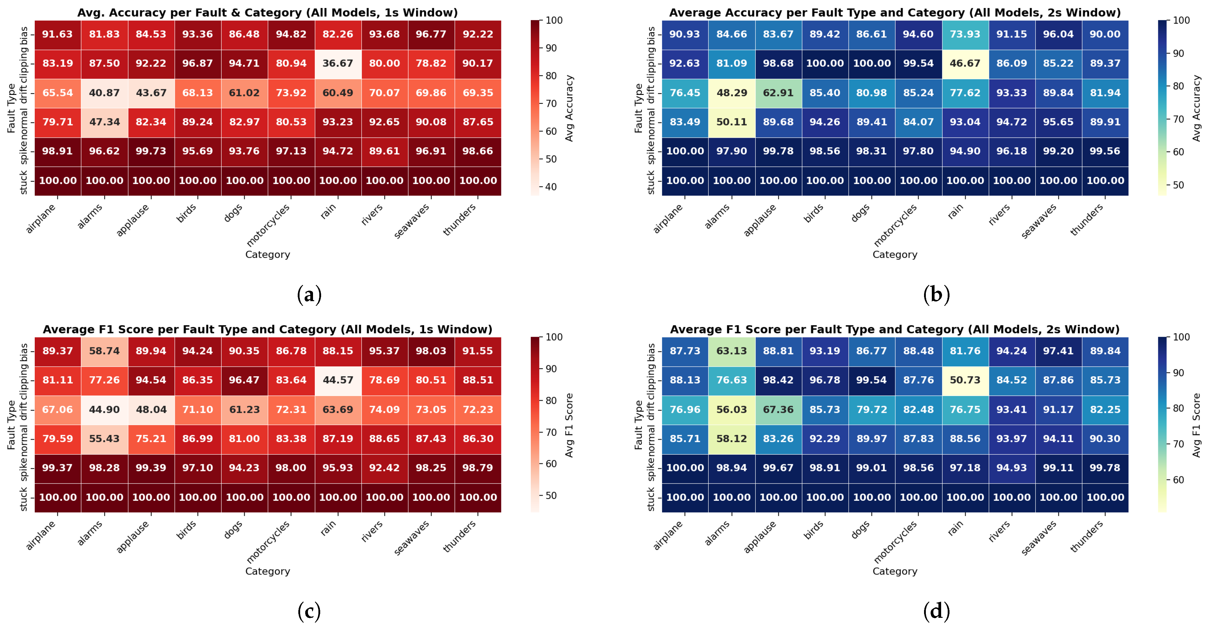 - A detailed experimental analysis was provided to support model selection for resource-constrained devices. The study also investigated how different sound categories, such as rain, alarms, and rivers, influence the ability to classify sensor faults.