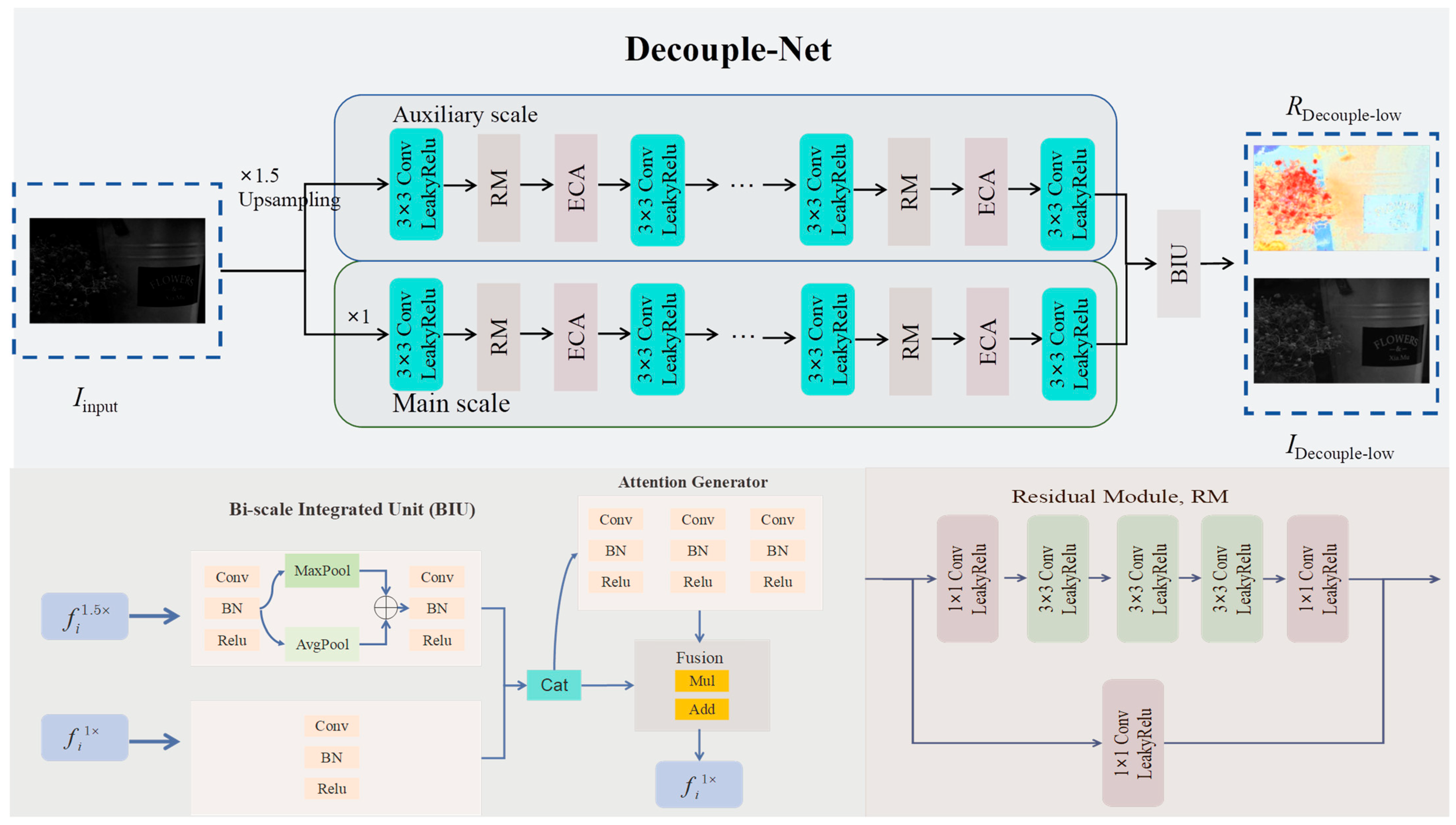 - The decoupling branch employs dual-scale feature aggregation to robustly estimate illumination and reflectance maps, achieving physically interpretable component representations.