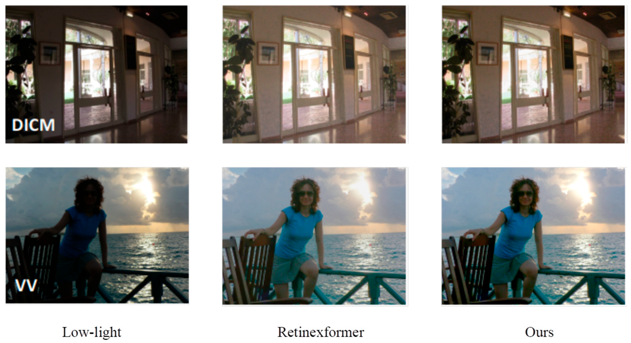 - Cai, Y.; Bian, H.; Lin, J.; Wang, H.; Timofte, R.; Zhang, Y. Retinexformer: One-Stage Retinex-Based Transformer for Low-Light Image Enhancement. In Proceedings of the IEEE/CVF International Conference on Computer Vision, Paris, France, 2–6 October 2023. [Google Scholar]