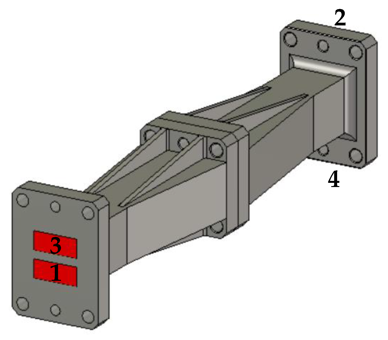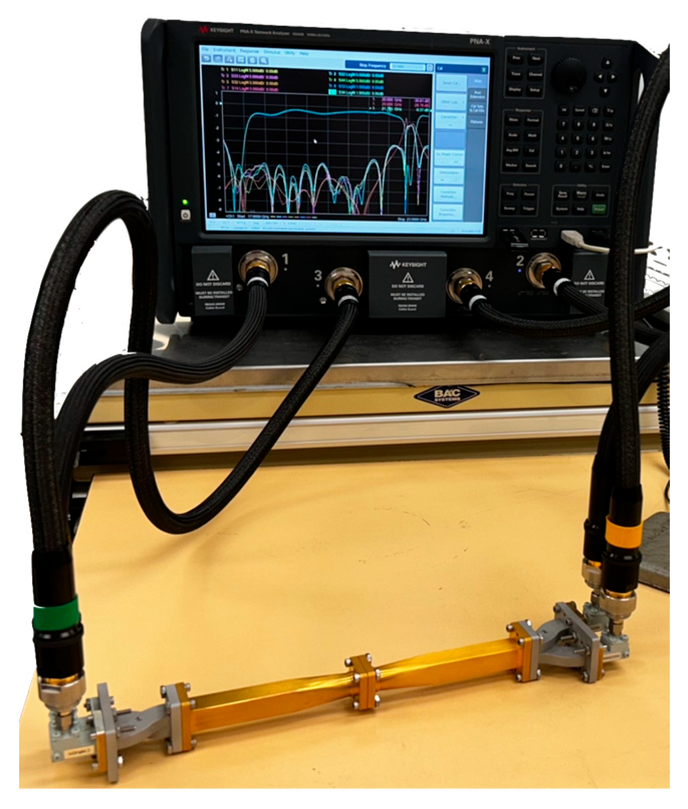 - Passi, D.; Leggieri, A.; Citroni, R.; Di Paolo, F. Broadband TE10 to TE20 Mode Transformer for X Band. Adv. Electromagn. 2016, 5, 69–72. [Google Scholar] [CrossRef]