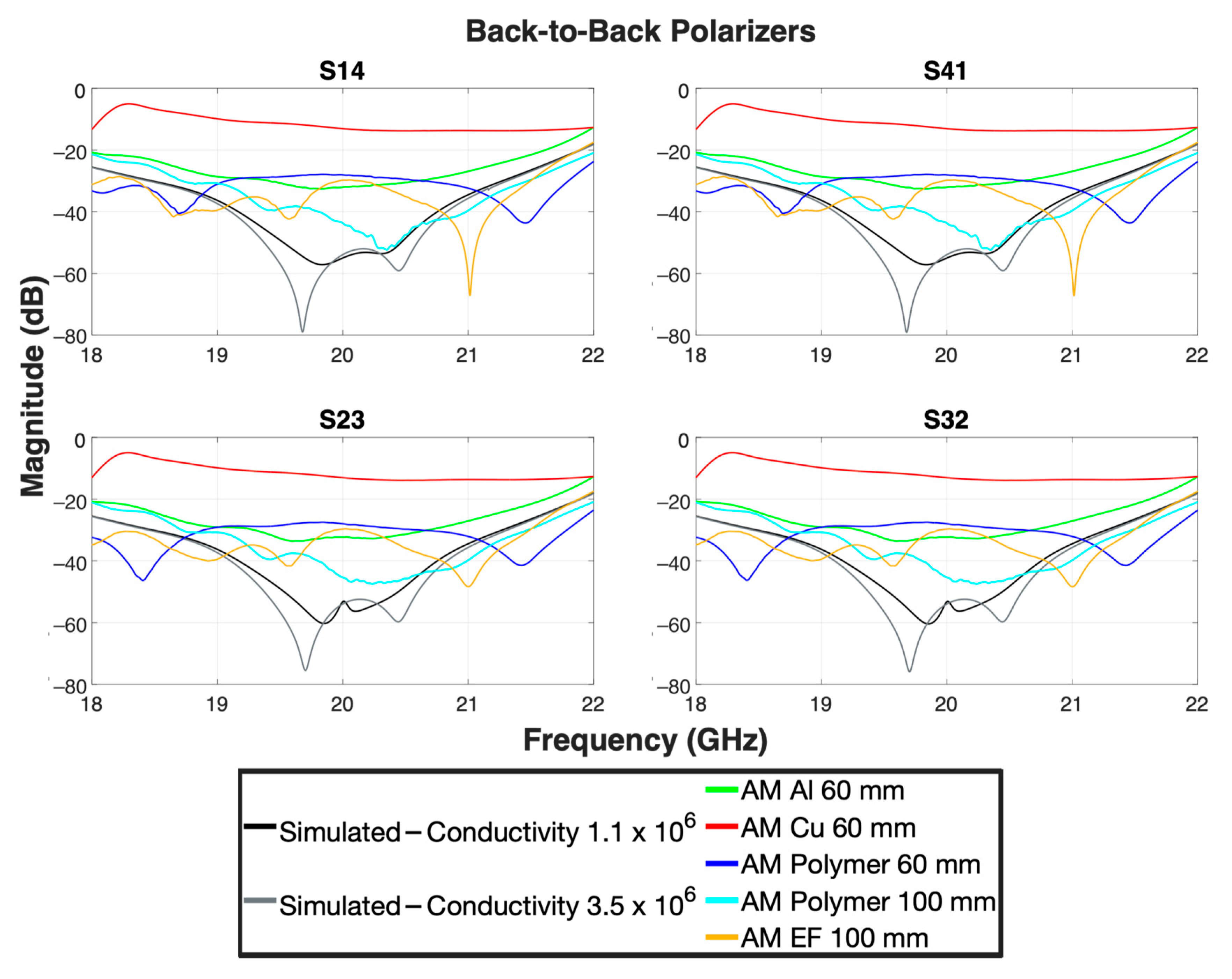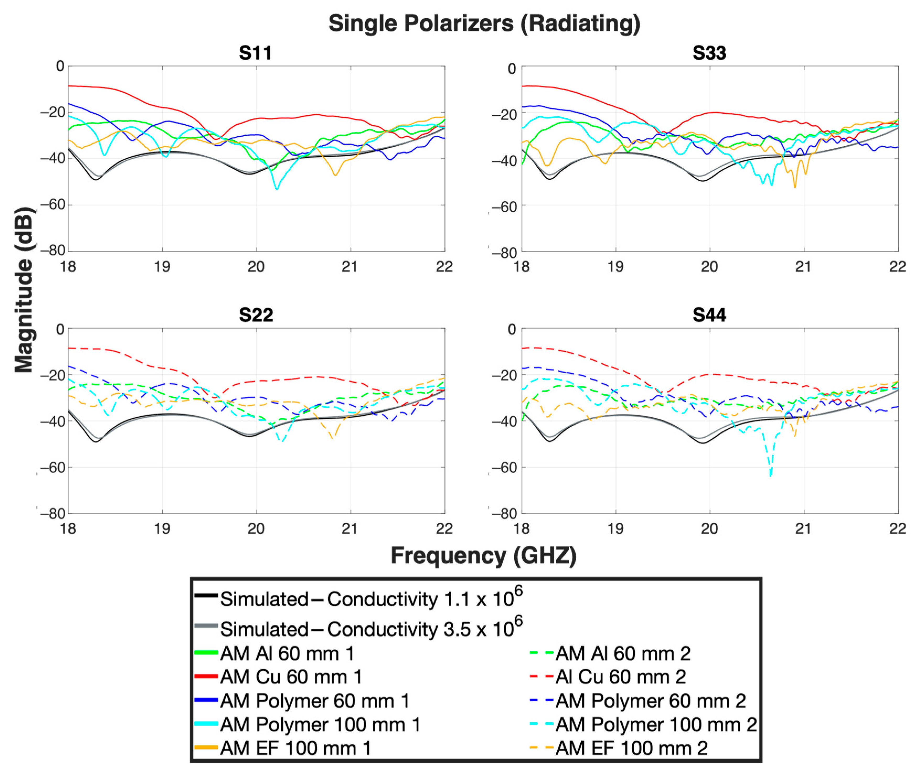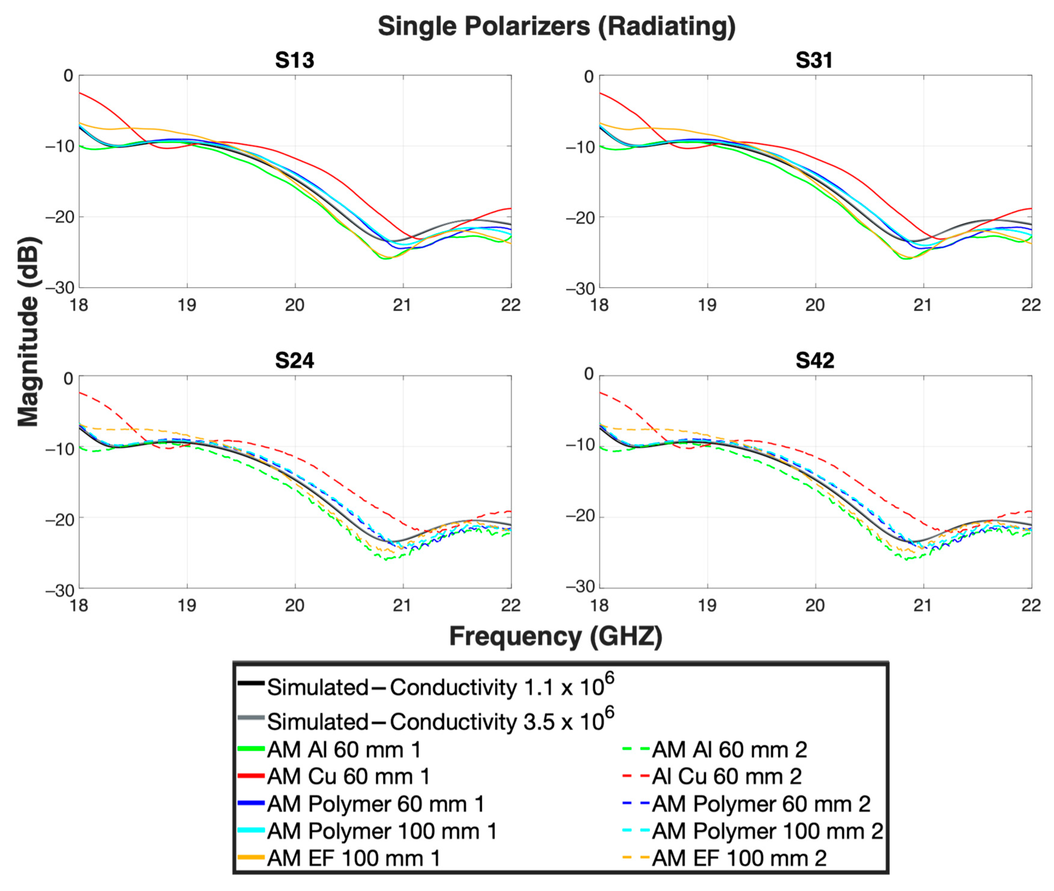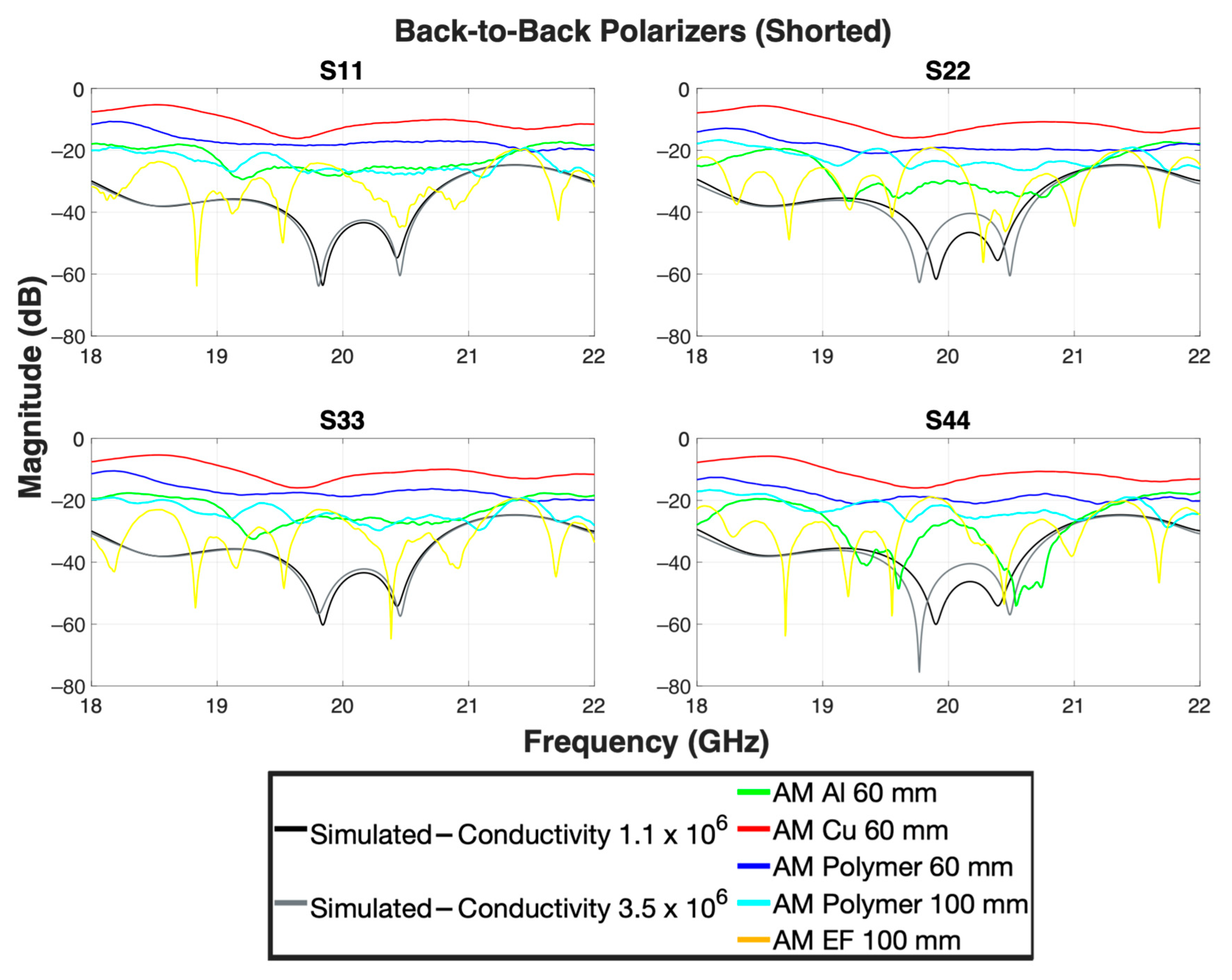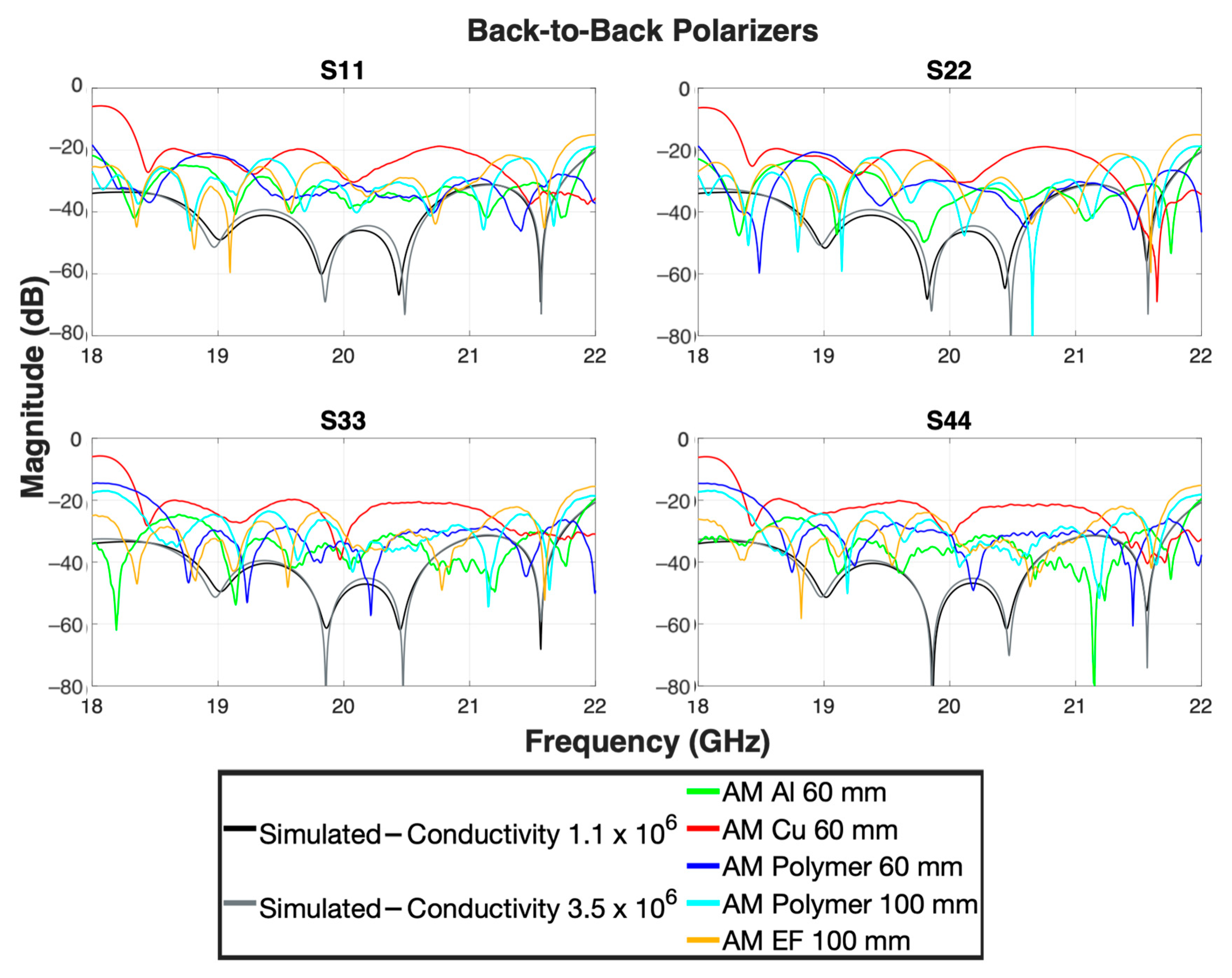 | Polarizers | S11 | S22 | S33 | S44 | S13, S31 | S24, S42 | S12, S21 | S34, S43 | S14, S41 | S23, S32 | Axial Ratio (Boresight) |