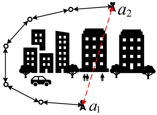 In the node localization process, traditional hop-count or hop-distance based localization methods typically rely on key information such as hop counts of optimal paths and single-hop distance estimation between target nodes and anchor nodes to estimate distances and calculate target node locations. However, in practical application scenarios, the complexity and non-uniformity of geographical environments pose significant challenges to signal propagation, such as signal reflection and refraction phenomena. These factors cause significant deviations between the cumulative length of communication paths and Euclidean distances between target nodes and anchor nodes, leading to substantial increases in localization errors and affecting the overall localization performance of algorithms, as shown in Figure 2.