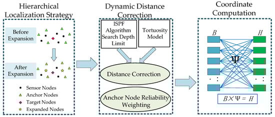 To address the aforementioned issues and overcome the limitations of existing multi-hop localization methods, this paper proposes an improved DV-Hop-HLPT algorithm. By systematically enhancing anchor node utilization, path distance estimation, and coordinate calculation, it improves the accuracy and robustness of multi-hop localization. The overall framework of this localization algorithm is shown in Figure 3: