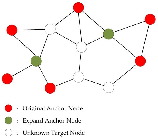 As shown in Figure 4, nodes that can maintain direct single-hop communication with at least three original anchor nodes are first selected. The RSSI calibration model is then used to estimate the distances between the selected node and the three anchor nodes. Subsequently, based on these distances and the corresponding anchor coordinates, the location of the extended anchor node is calculated using the least squares method. The reliability of the extended anchor node’s estimated location is further evaluated using the Root Mean Square Residual. The resulting hybrid anchor node set is thus not only expanded in quantity but also capable of distinguishing the credibility of different anchors during localization, effectively controlling potential error propagation introduced by the extended anchor nodes.Use the following residual formula to evaluate the reliability of the anchor node.